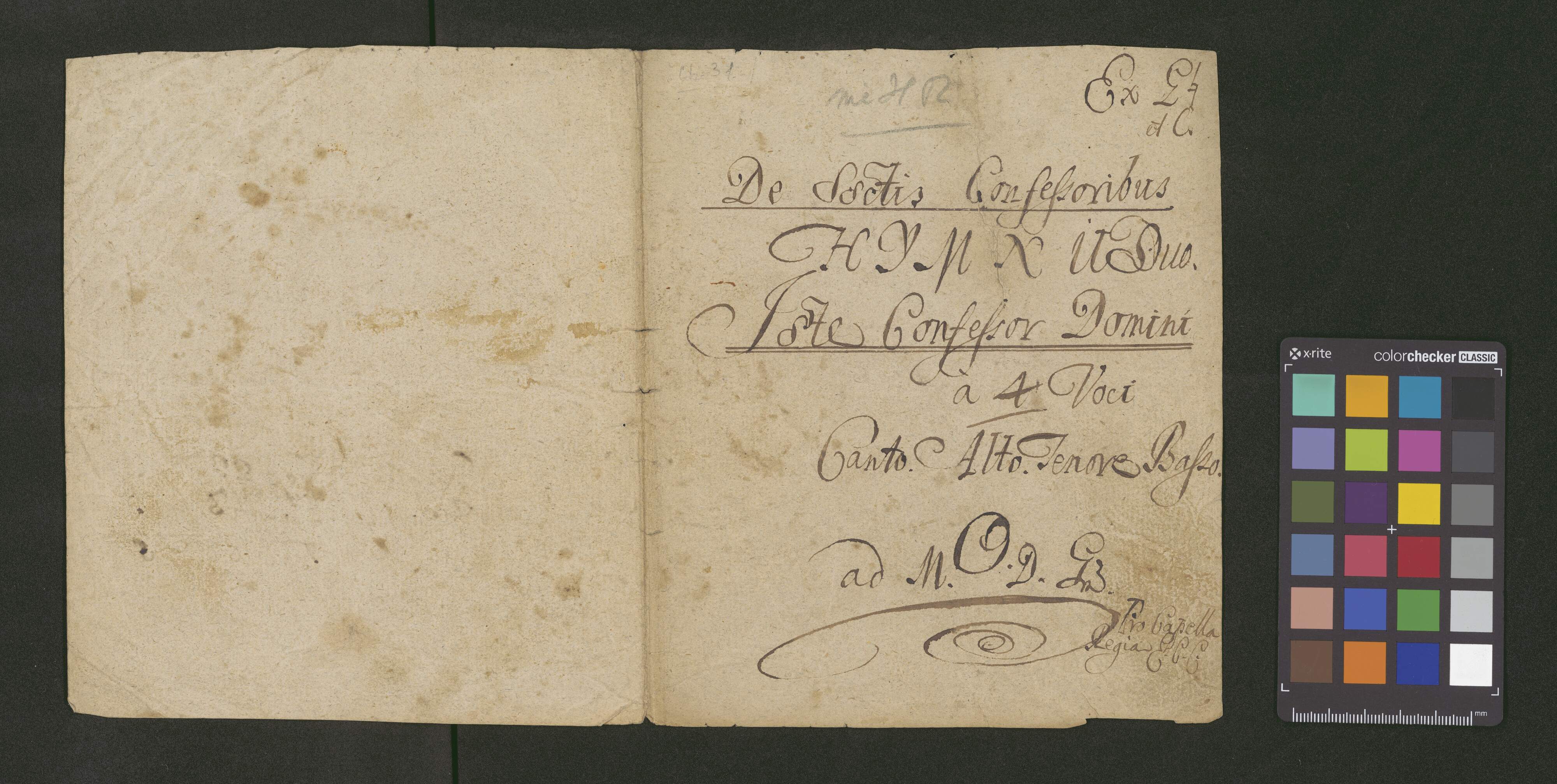 Ex E et C. | De Sacits Confessoribus | H Y M N II Duo. | Iste Confessor Domini | à 4 Voci | Canto. Alto. Tenore Basso. | ad M. D. G. | Pro Capella | Regia E.C.C