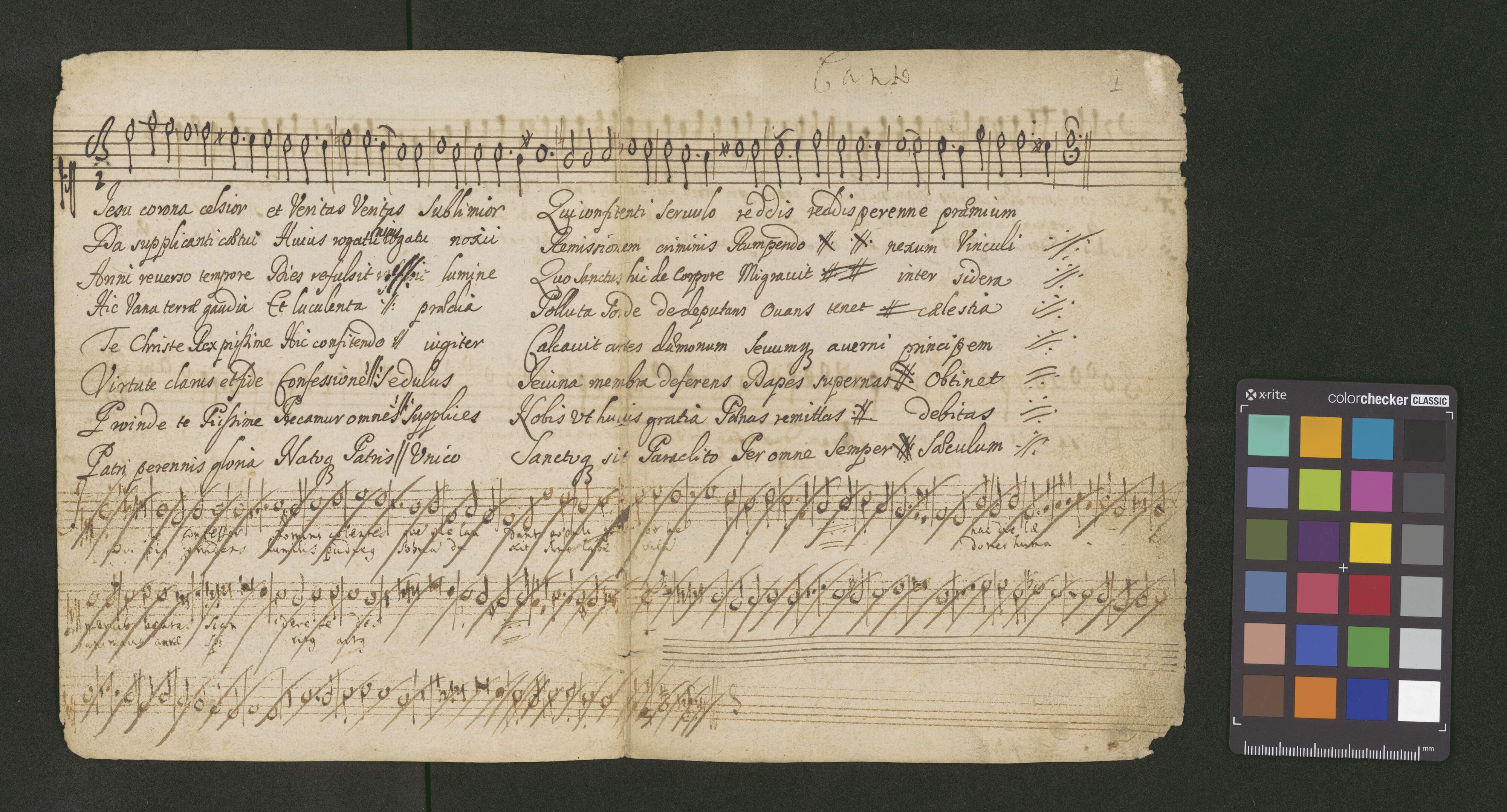 Ex E et C. | De Sacits Confessoribus | H Y M N II Duo. | Iste Confessor Domini | à 4 Voci | Canto. Alto. Tenore Basso. | ad M. D. G. | Pro Capella | Regia E.C.C