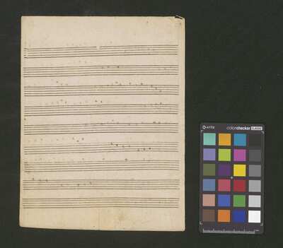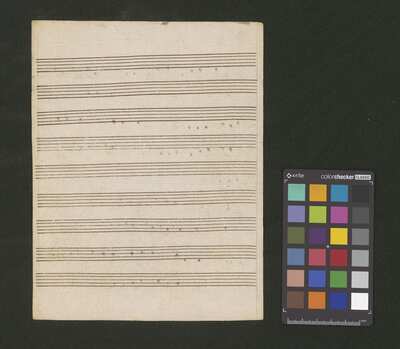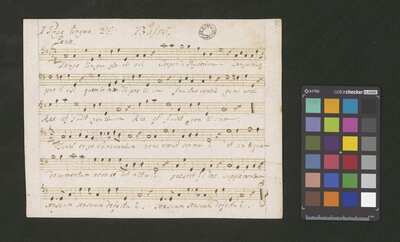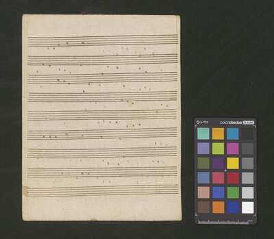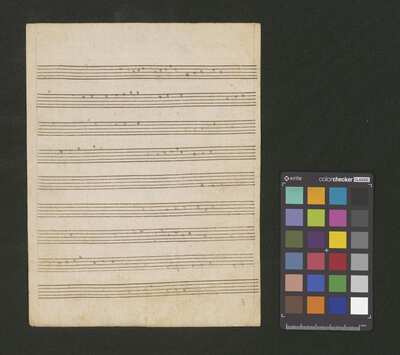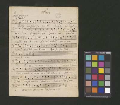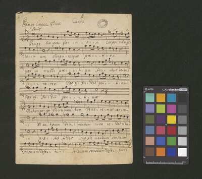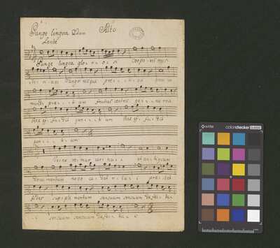 1 score, [pl-text: na wewnętrznej stronie obwoluty okrągła pieczęć: „ARCHIWUM I BIBLIOTEKA * Krakowskiej Kapituły Katedralnej”], [pl-text: na kartach 1r, 2r, 3r, 4r, 5r owalna pieczęć: „CATH. CRAC. * ARCH. CAPIT.”]