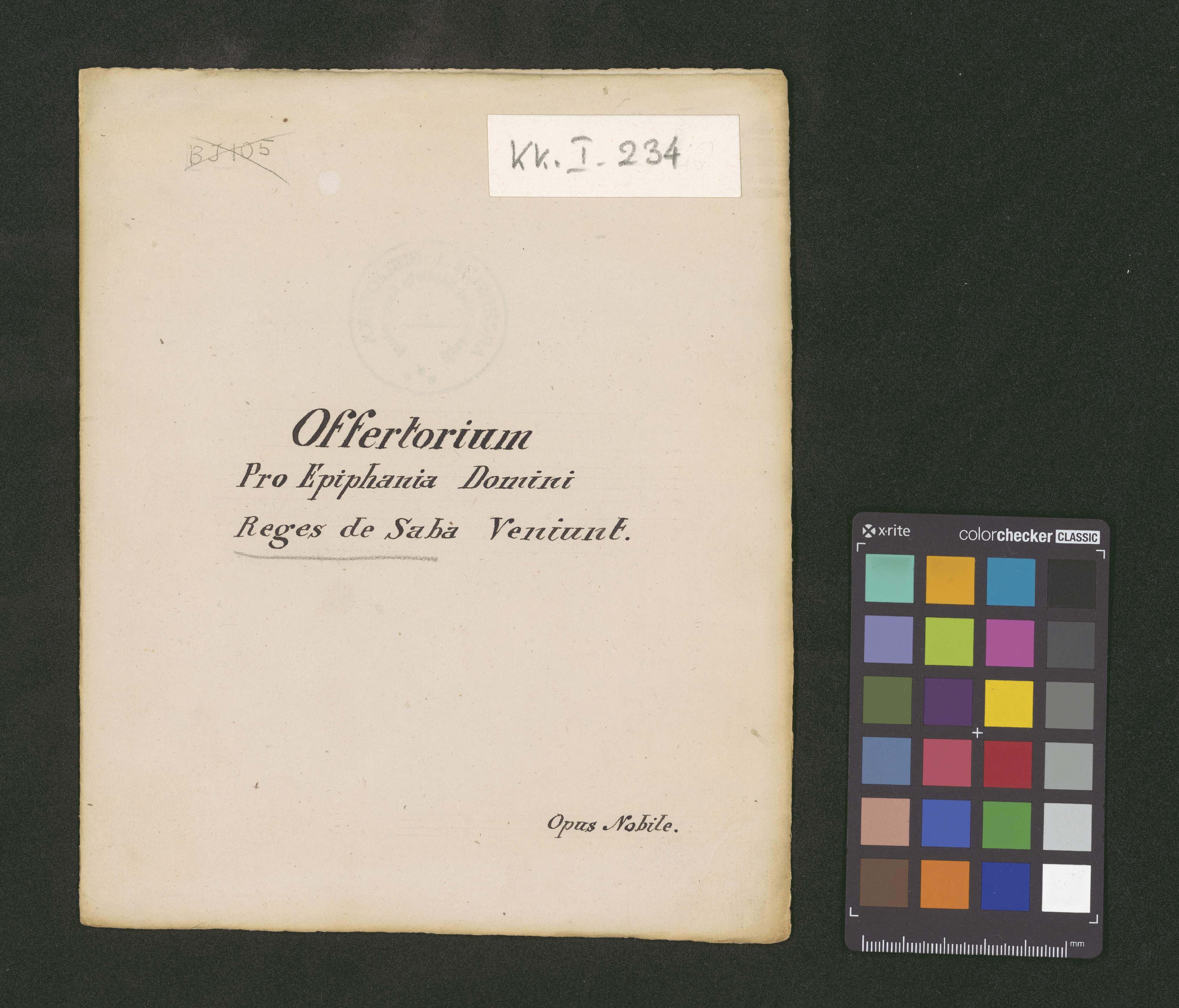 [page title:] [u góry skreślone:] SJ 105 | [poniżej, nieskreślone:] Offertorium | Pro Epiphania Domini | [podkreślone ołówkiem:] Reges de Saba [bez podkreślenia:] Veniunt. | Opus Nobile