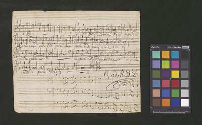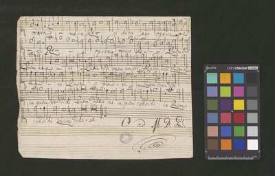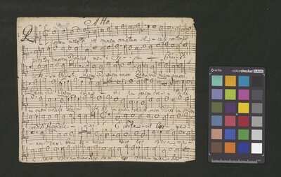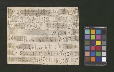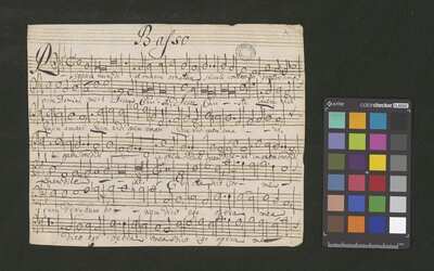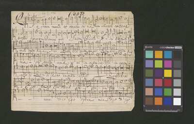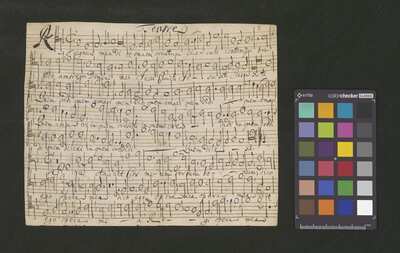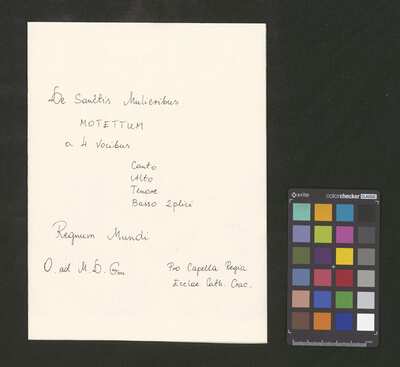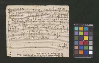 [pl-text: na kartach 1v, 2r, 3v, 4r owalna pieczęć: „CATH. CRAC. * ARCH. CAPIT.”], [pl-text: na kartach 1v, 2v, 3v, 4v adnotacja: "O ad M. D. Gm."], [pl-text: u dołu karty 2v fragment drukowanego tekstu, zapisanego odwrotnie niż materiał nutowy - jest to końcowy fragment spisu kompozycji: "IX. Est dies trophei. à 4. C.A.T.B. con VV. per ogni Santo o Santa. | X. Salve Regina. à 4. C.A.T.B. con VV."], [pl-text: na kartach 3v i 4v fragmenty obcej kompozycji]