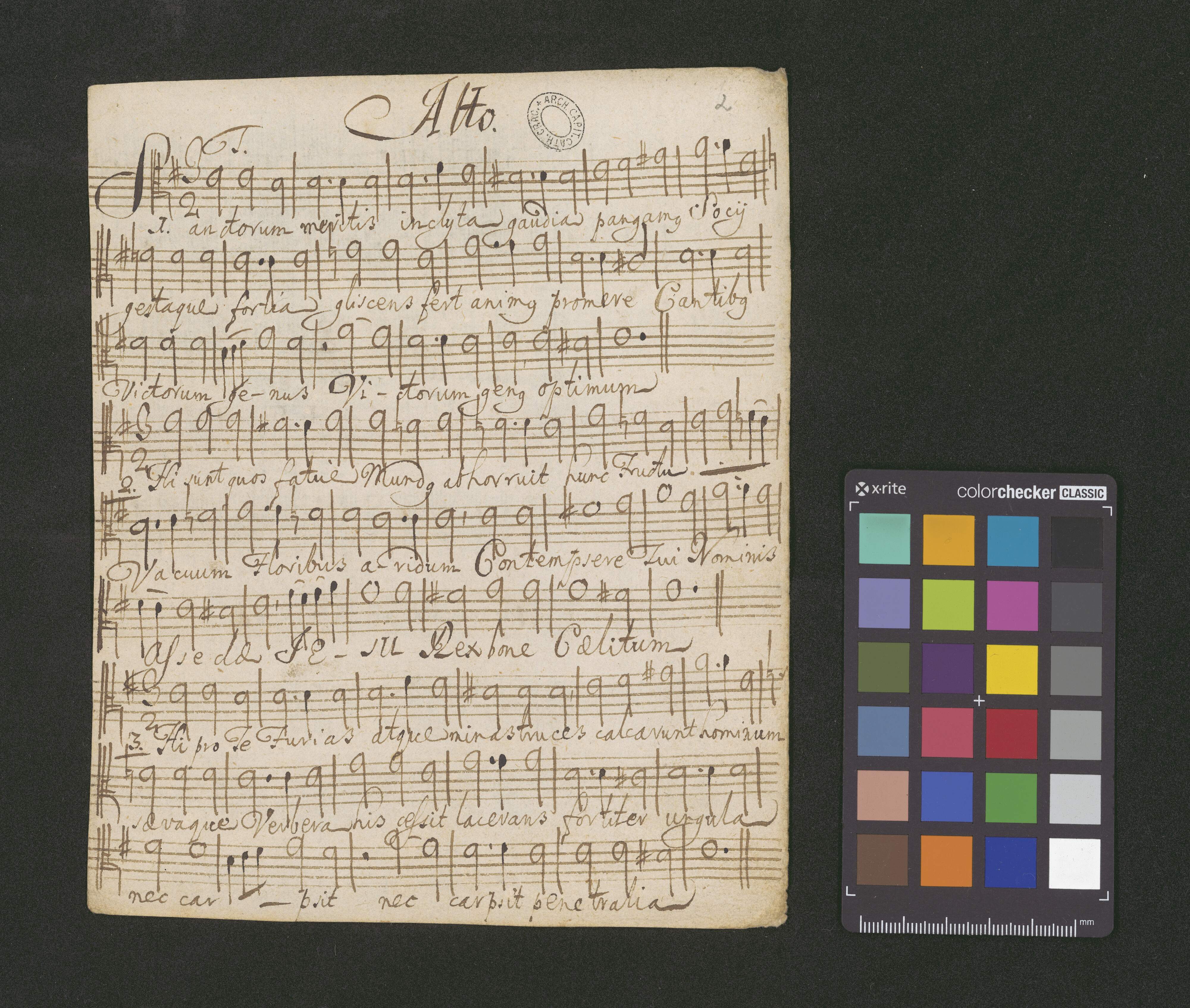 [page title:] De Comuni Plurimorum Martyrum | HYMNUS II | à 4 Vocibus Paribus | Canto Tenore | Alto Basso | I. Rex Gloriose Martyrum | II. Sanctorum Meritis | O. ad M. D. Gm. | Pro Capella Regia | Eccl[esi]ae Cath. Crac