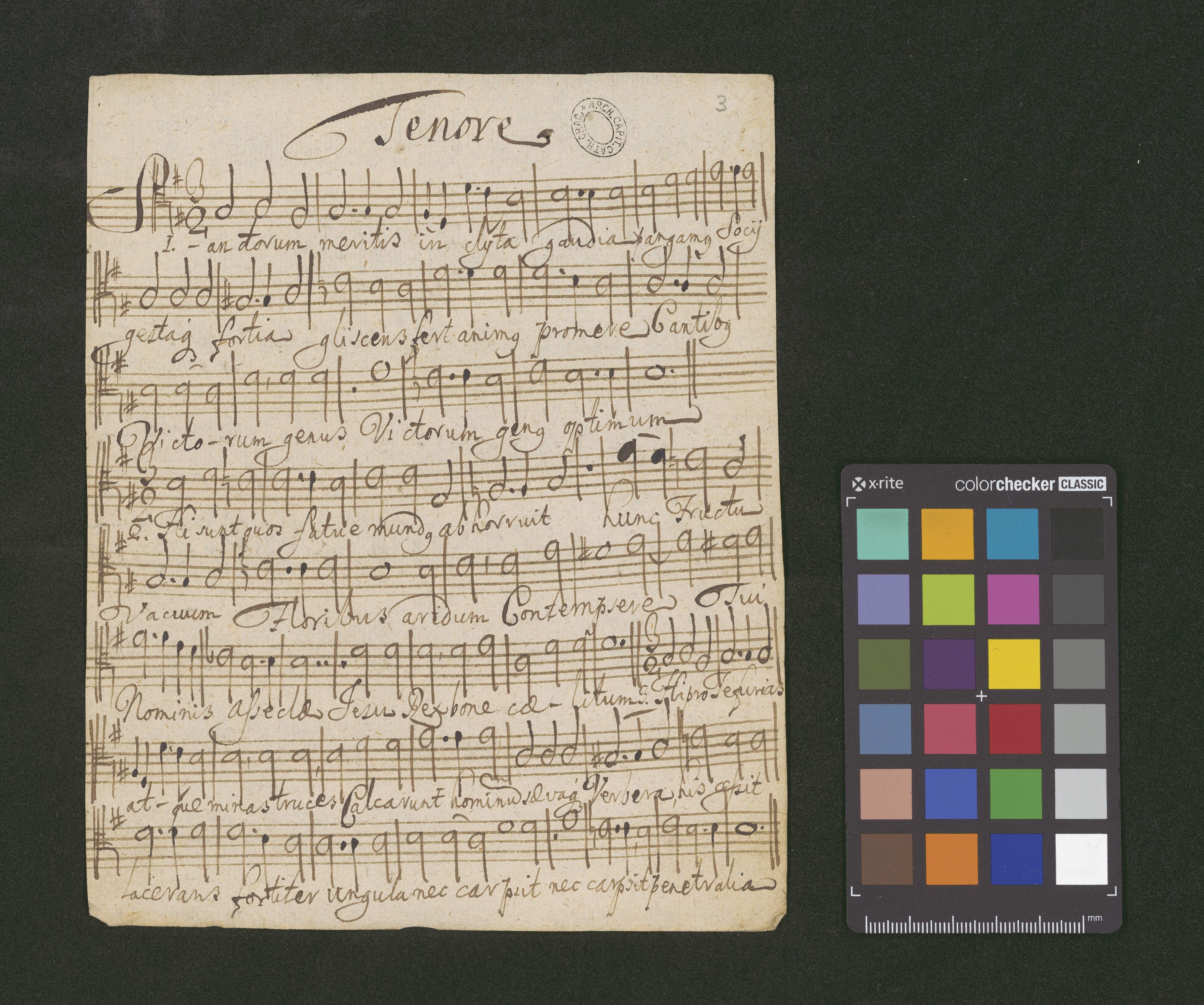 [page title:] De Comuni Plurimorum Martyrum | HYMNUS II | à 4 Vocibus Paribus | Canto Tenore | Alto Basso | I. Rex Gloriose Martyrum | II. Sanctorum Meritis | O. ad M. D. Gm. | Pro Capella Regia | Eccl[esi]ae Cath. Crac