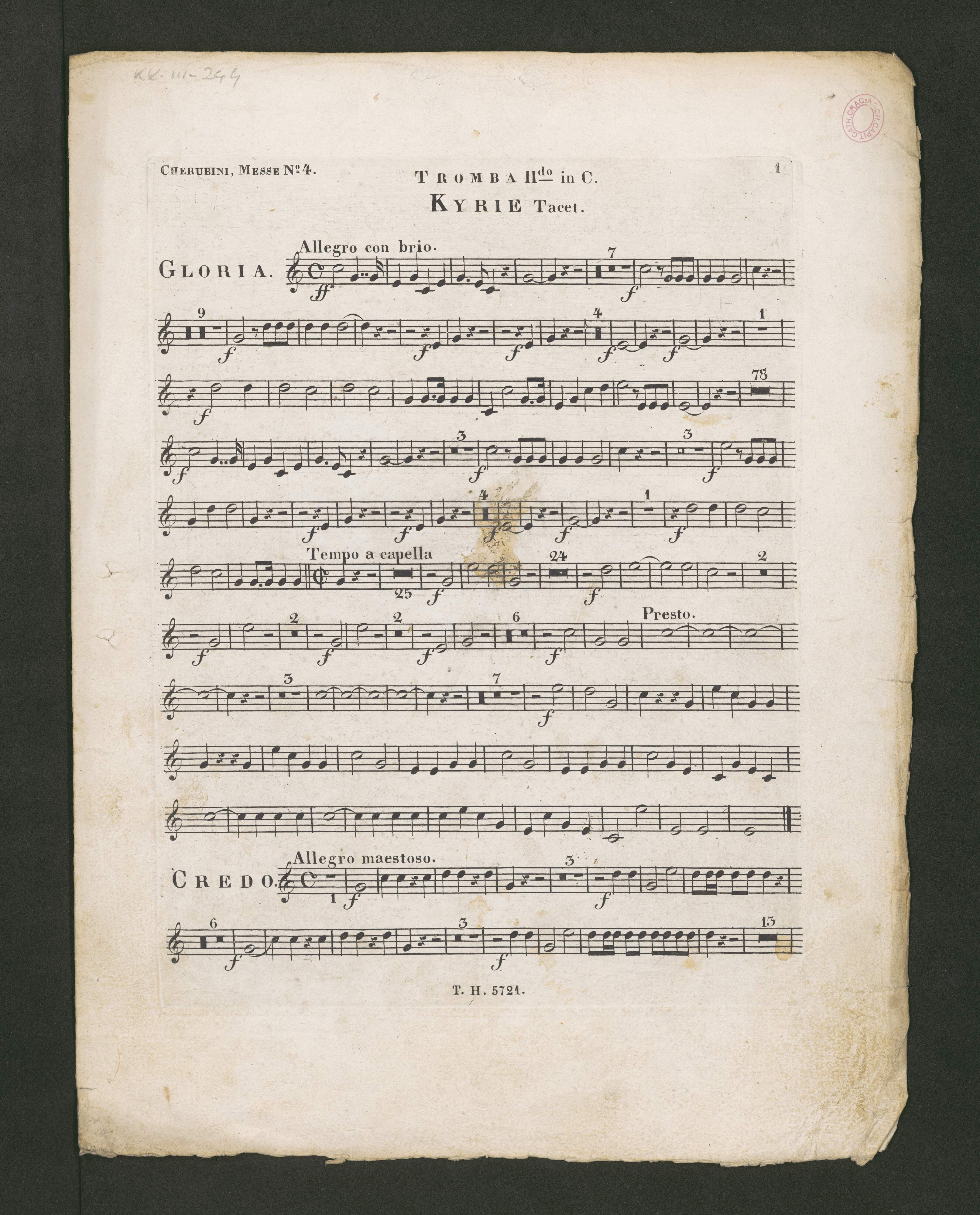 Vierte Messe in C-dur für vier Solo-Singstimmen und Chor, 2 Violinen, Viola, Violoncello und Contrabaß, 2 Flöten, 2 Hoboen, 2 Clarinetten, 2 Fagotte, 2 Hörner, 2 Trompeten und Pauken [Wien, Tobias Haslinger]