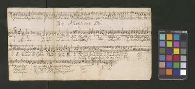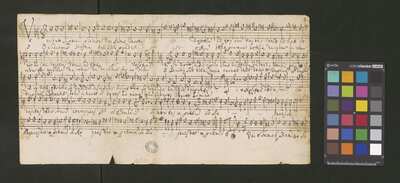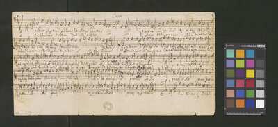 [pl-text: Pieczęć: „CATH. CRAC. * ARCH. CAPIT.” umieszczona na f. 1r, 2r, 3r, 4r, 5v (dwukrotnie).], [pl-text: Współcześnie dodana karta tytułowa.], [pl-text: Foliacja w źródle naniesiona ołówkiem. Ponadto każda storna verso opatrzona numerem "2" (także ołówkiem).], [pl-text: Druga z partii B (folio 5) spisana inną ręką i na innym papierze, jednak jest to ten sam materiał nutowy co w partii B (folio 4).], [pl-text: Nazwy głosów widoczne tylko na f. 1, 2 (głos Canto oraz Alto).], [pl-text: Sygnatura spisana ołówkiem w lewym dolnym rogu folio 1r.]