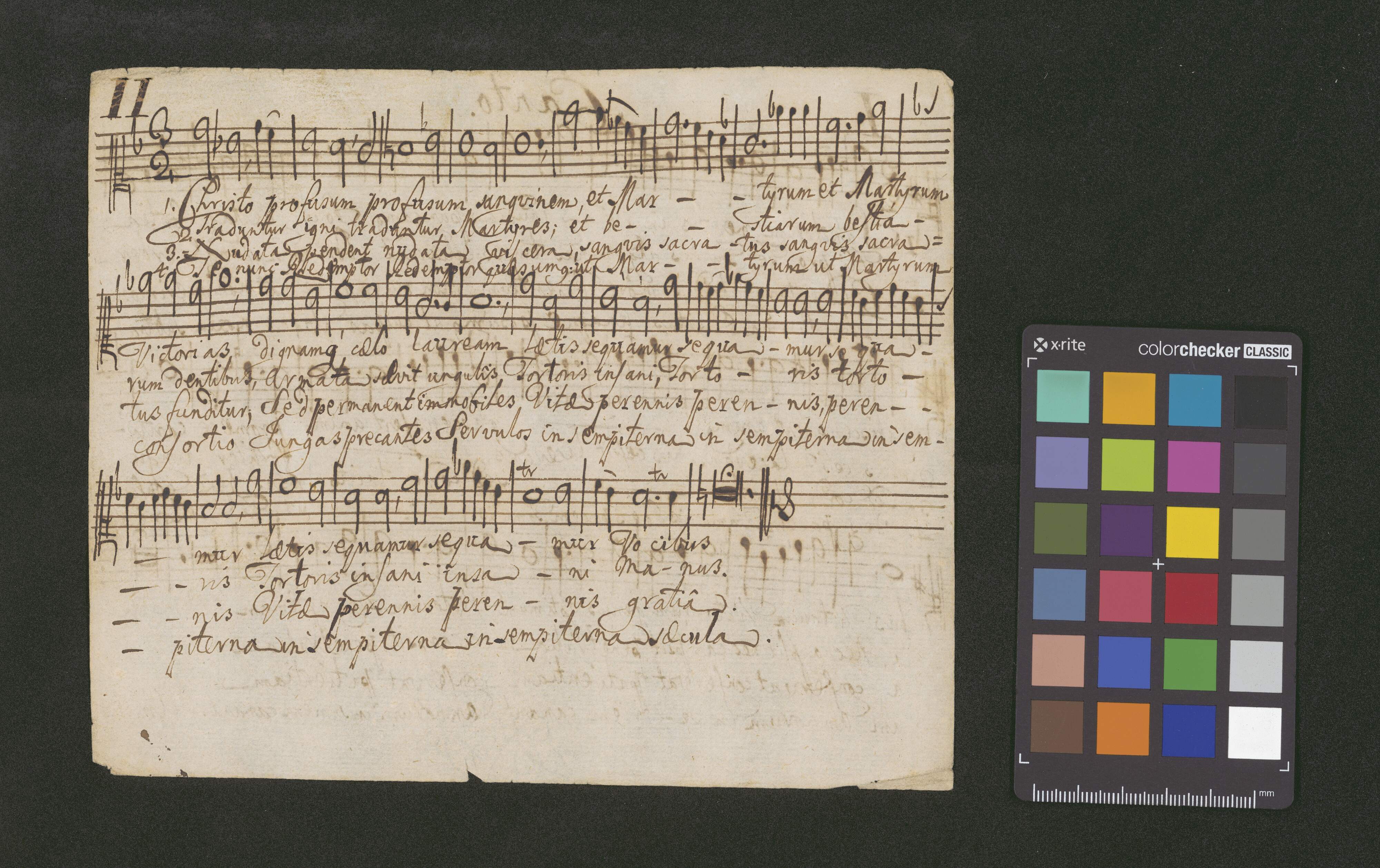 [on the contemporary added cover, in pencil:] Hymni due | De [large space] ex G♮ et G | SS Pluribus | Martyribus | a 4 Voci | 1. Sanctorum meritis | 2. Christo profusum sangvinum | Opus Nobile