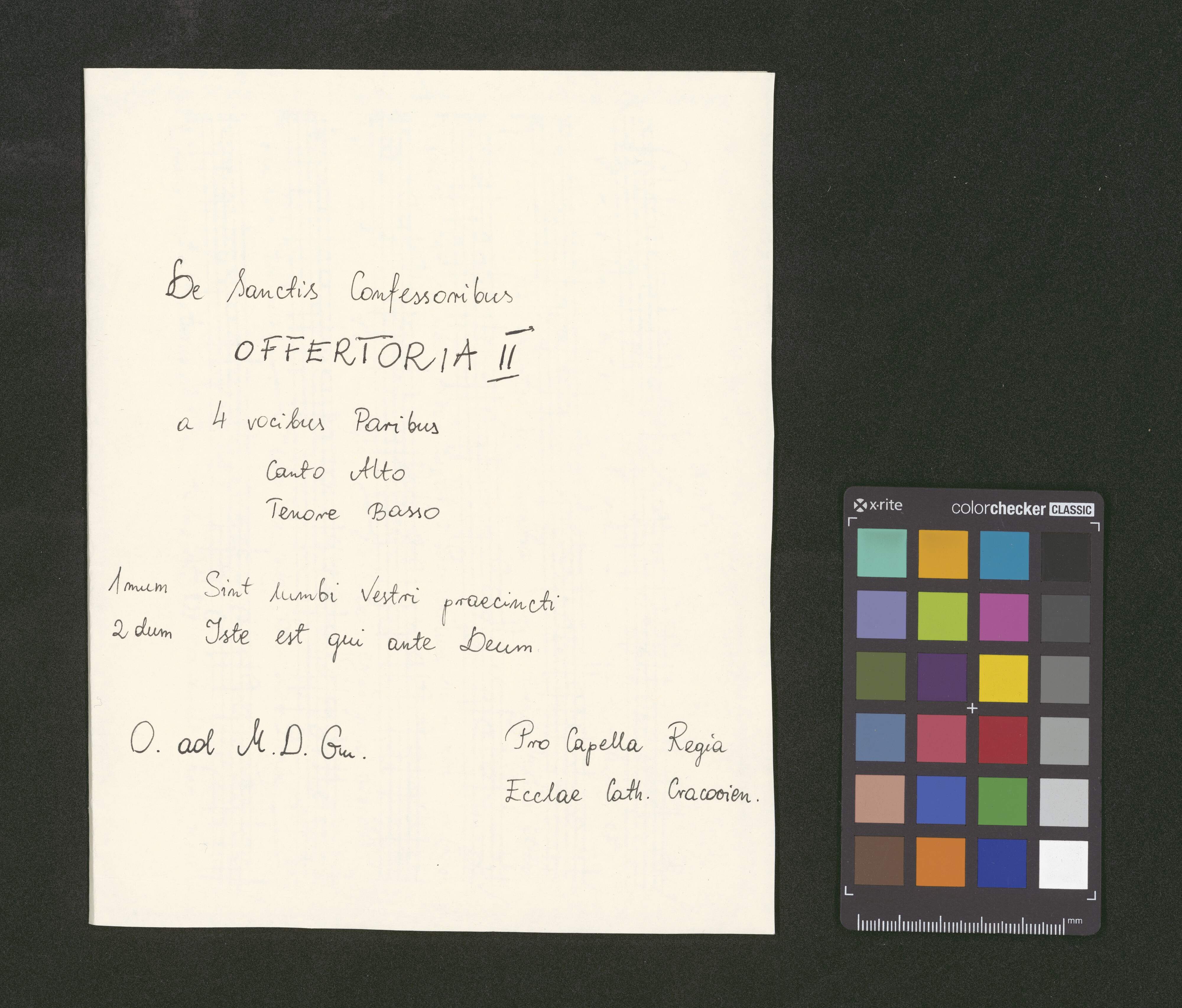 [on the contemporary added title card:] De Sanctis Confessoribus | OFFERTORIA II | a 4 vocibus Paribus | Canto Alto | Tenore Basso | 1mum Sint lumbi Vestri praecincti | 2dum Iste est qui ante Deum | [on the left:] O. ad M.D.Gm. [on the right:] Pro Caeplla Regia | Ecclae Cath. Cracovien