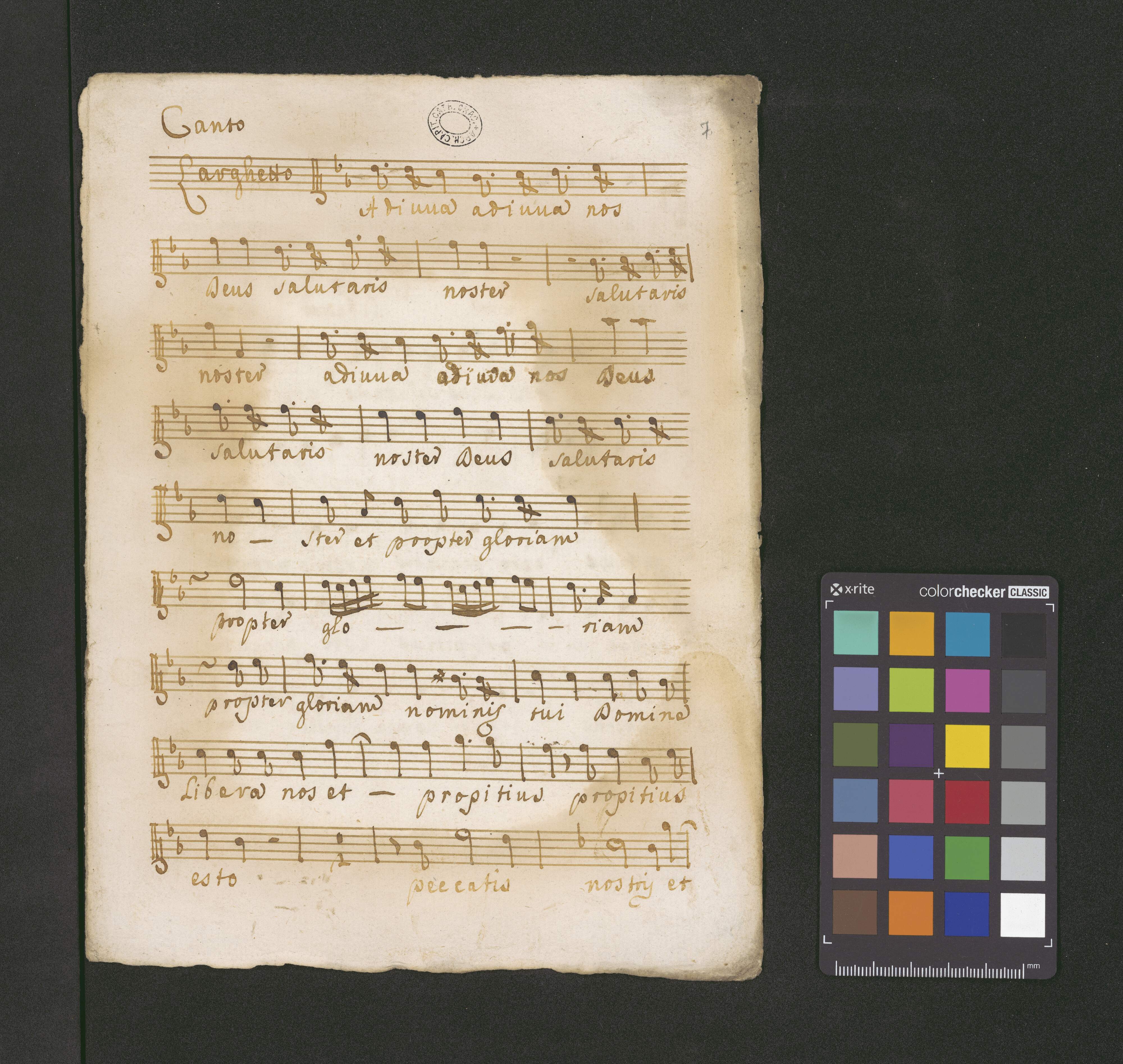 [page title 1:] [w prawym górnym rogu:] I | Casali Giov. Battista + 1792 | Graduali Offertorii | de [?] Domini | a 4 voce | [u dołu strony notatki liczbowe]; [page title 2:] Motetto à 4 voci | Adiuva nos Deus | Organo | Del Sig Mro Gio: Batta Casali Romano