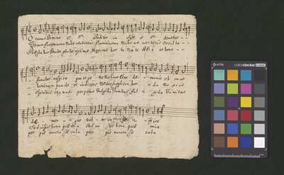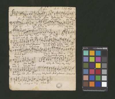 2 scores, [pl-text: na kartach 1r, 2r, 3r, 4r, 5r owalna pieczęć: „CATH. CRAC. * ARCH. CAPIT.”], [pl-text: u góry karty 1r adnotacja: "A. GGG. 1698"], [pl-text: u góry karty 3r adnotacja: "A A GGG. 1698."], [pl-text: u góry karty 4r adnotacja: "A A GGG 1698"], [pl-text: na karcie 5v, pod partią Basso ripieno fragment obcego zapisu nutowego], [pl-text: partia Basso ripieno odnosi się wyłącznie do utworu Iste confessor Domini]