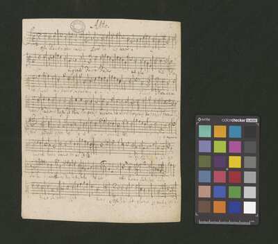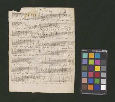 1 score, [pl-text: na wewnętrznej stronie obwoluty: okrągła pieczęć: „ARCHIWUM I BIBLIOTEKA * Krakowskiej Kapituły Katedralnej”], [pl-text: na kartach 1r, 2r, 3r, 4r owalna pieczęć: „CATH. CRAC. * ARCH. CAPIT.”], [pl-text: naderwany prawy dolny róg karty 4r oraz dolny lewy róg karty 4v]