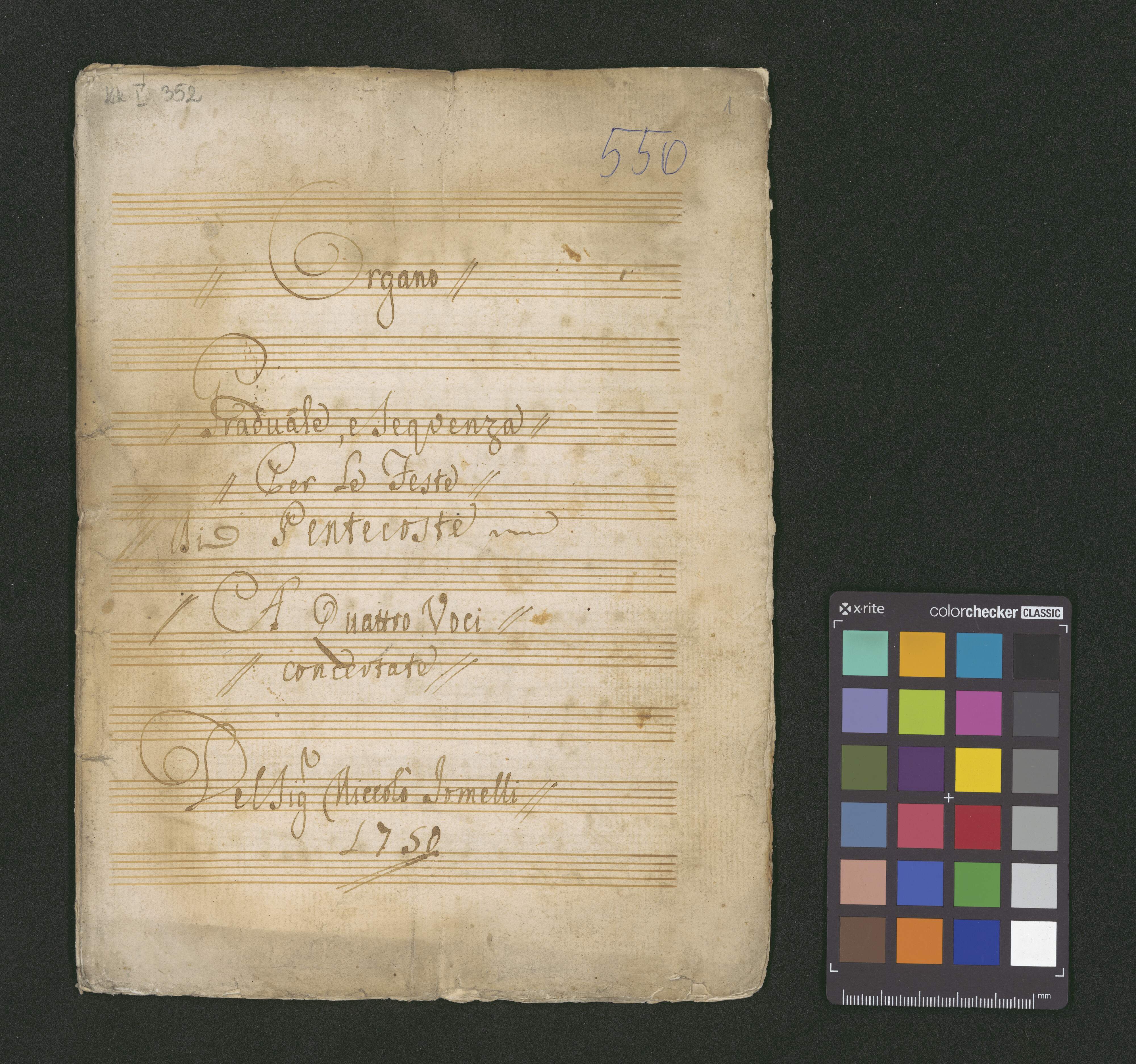 [cover from Organo part:] Organo | Graduale, e sqvenza | Per Le Feste | di Pentecoste | A Quatro Voci | concertate | Delsig' Nicolo Jomelli | 1750
