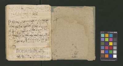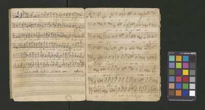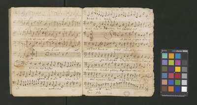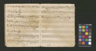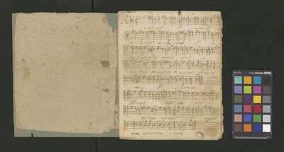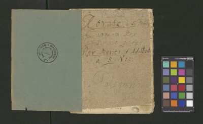 4 scores, [pl-text: na przedniej stronie okładki adnotacja ołówkiem: "Ch. 140"], [pl-text: na wewnętrznej stronie obwoluty pieczęć „ARCHIWUM I BIBLIOTEKA”, „Krakowskiej Kapituły Katedralnej”], [pl-text: na karcie 1r, 2r 3v, 4v, 5v, 6r, 7v, 8v, 9r 10r, 11v, 12r pieczęć „CATH. CRAC. * ARCH. CAPIT.”]