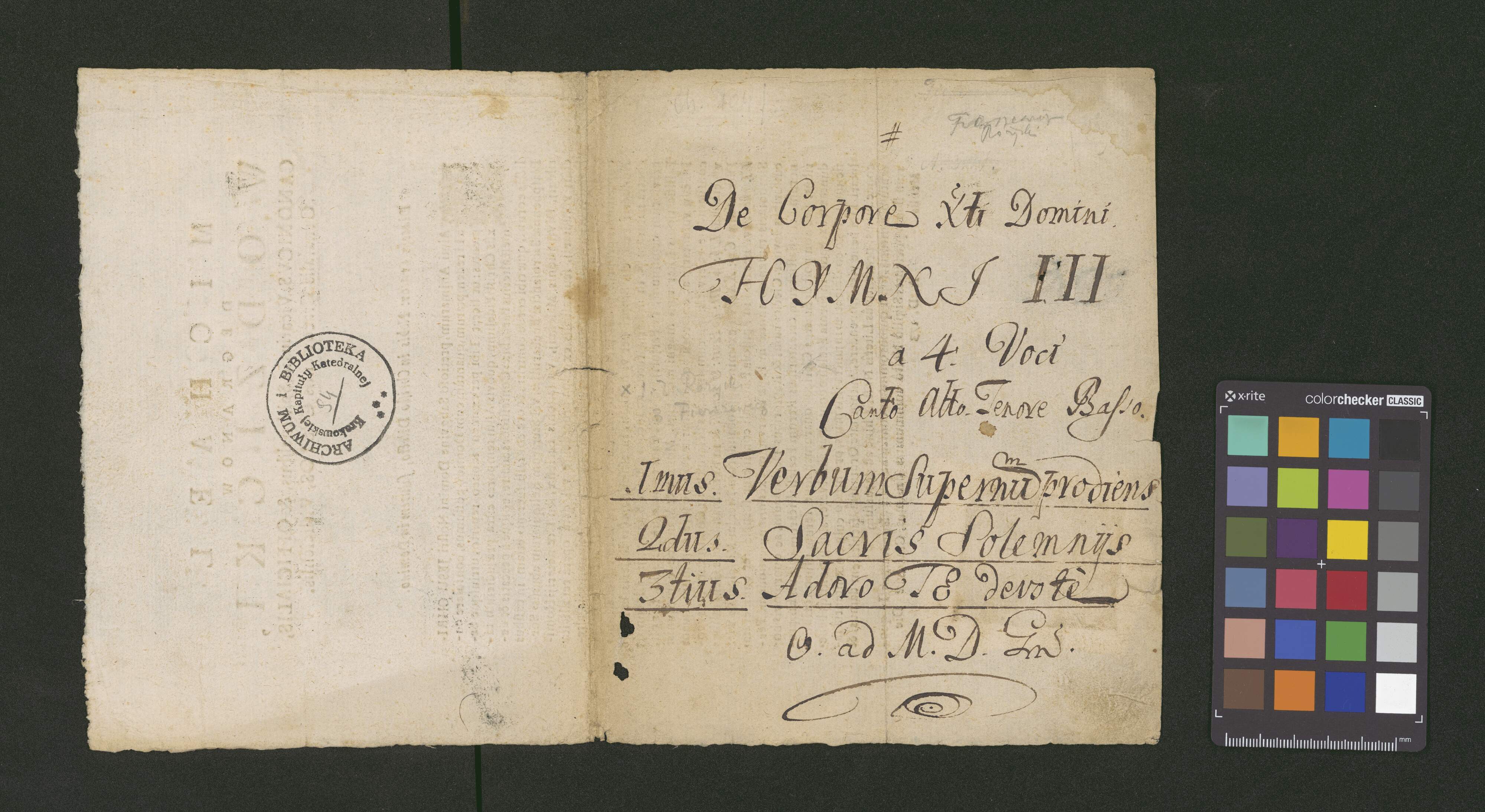 [page title:] # | De Corpore Xti Domini | HYMNI III | a 4 Voci | Canto alto. Tenore Basso. | Imus. Verbum Supernum prodiens | 2dus. Sacris solemnis | 3tius. Adoro Te devote | O. ad M. D. Gm