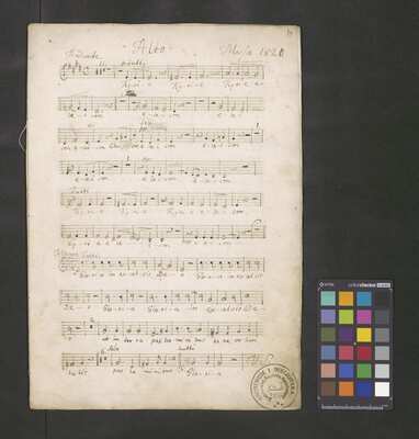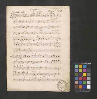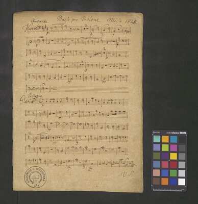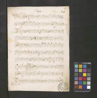 [pl-text: Pieczęć: „ARCHIWUM I BIBLIOTEKA”, „Krakowskiej Kapituły Katedralnej” na karcie tytułowej i pierwszych stronach wszystkich głosów.], [pl-text: Pieczęć: "CATH. CRAC. * ARCH. CAPIT." na stronach recto głosów vl 1 (pierwszy egzemplarz), vl 2 (drugi egzemplarz), A, T, cor 1, cor 2przedostatniej stronie vl 2 (pierwszy egzemplarz), C i B oraz ostatniej stronie vl solo, va, fl, ob, cl 1, cl 2, trb, tr, timp, vlne i org., [pl-text: Różnice w ilości stron w dubletach.], [pl-text: Foliacja w źródle naniesiona ołówkiem.]