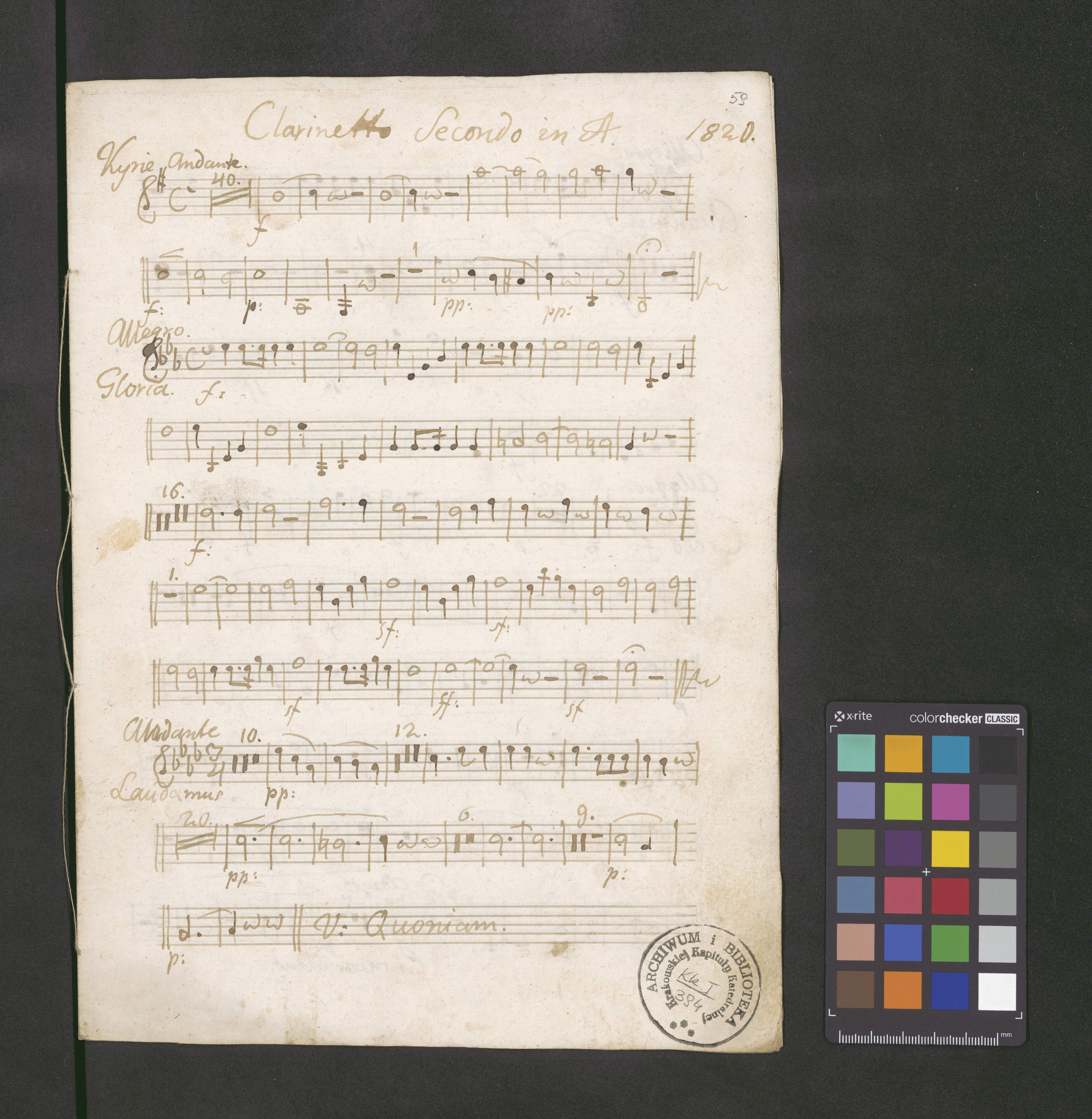 Missa | a | Canto Alto | Tenore Basso | Violi: | Primo | Secondo | Viola | Flauto Oboa | Clarinetti | Primo. obligatto | Secondo | Corni | Primo obligato | Secondo | Trombone. | Tromba Timpani | Contrabasso et Organo. | Anno 1820