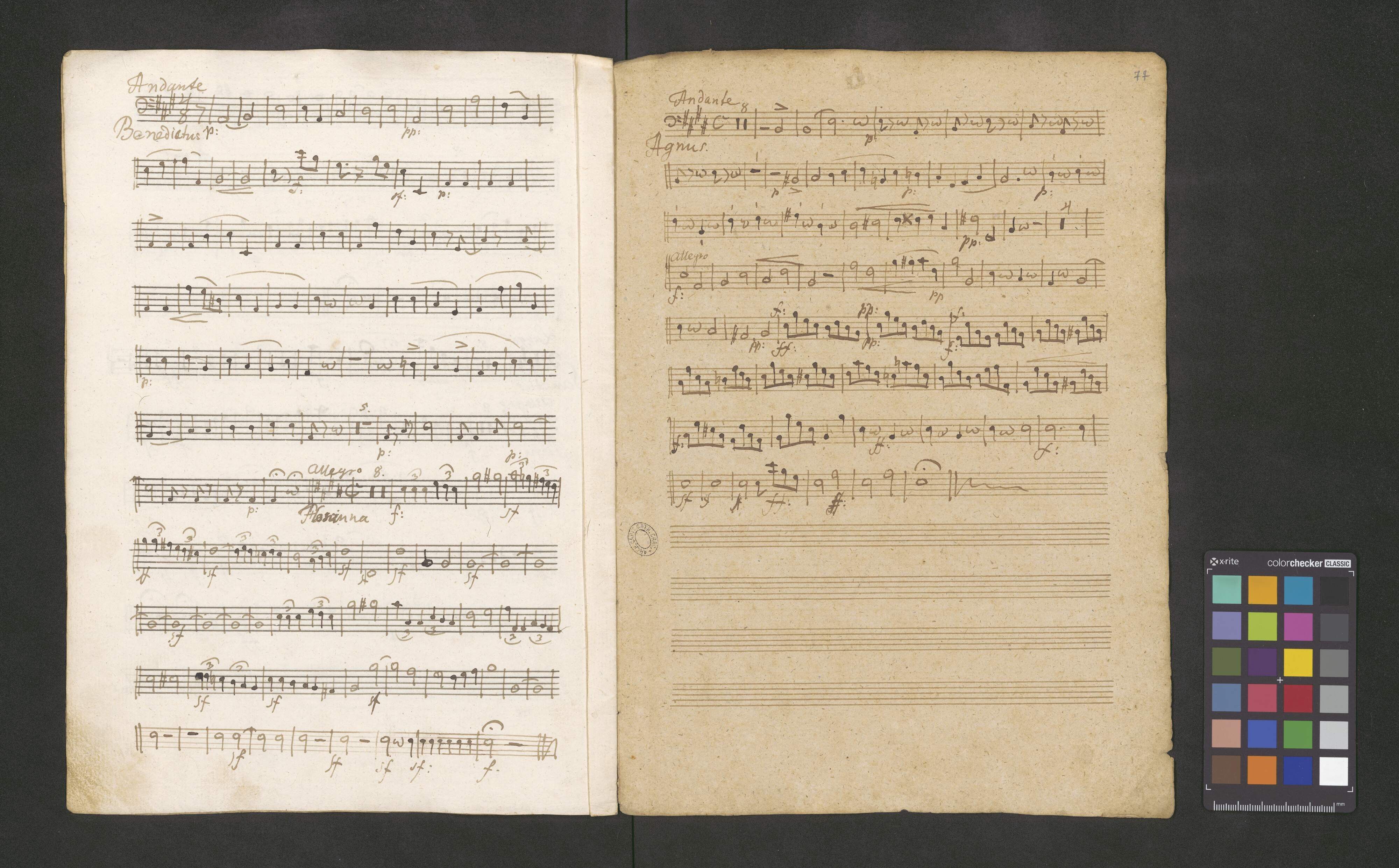 Missa | a | Canto Alto | Tenore Basso | Violi: | Primo | Secondo | Viola | Flauto Oboa | Clarinetti | Primo. obligatto | Secondo | Corni | Primo obligato | Secondo | Trombone. | Tromba Timpani | Contrabasso et Organo. | Anno 1820