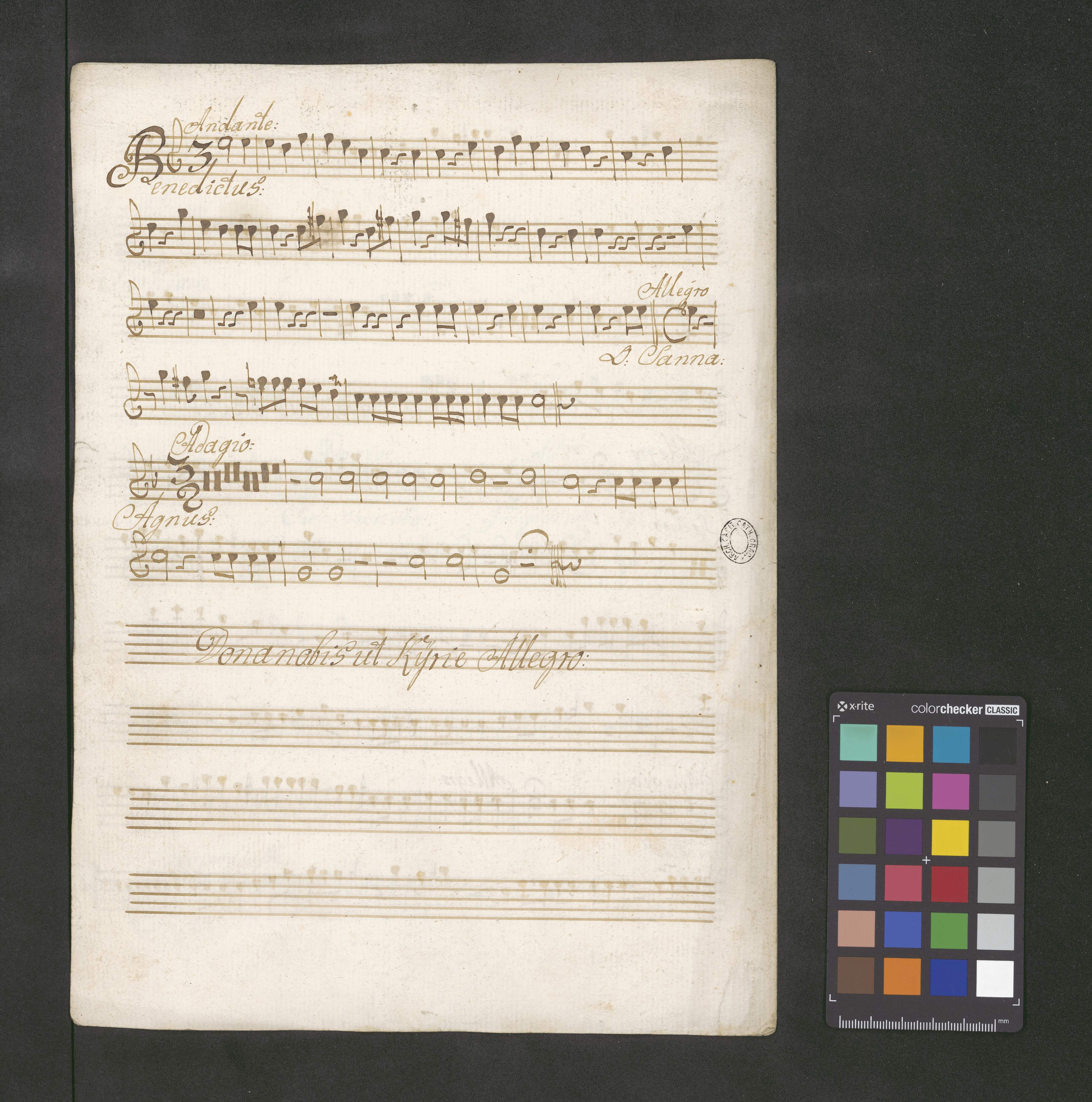[title page:] Missa [with other hand:] "C.A.T.B. | Violinis 2bus | Obois 2bus | Clarinis 2bus | Organo et Timpano" | Authore Dem. Albrechtsberger. Ese. C. | [with other hand:] "Compavad Ao 1796 dielg Glois C Lochman Awafers awafers Musica Pnefen"