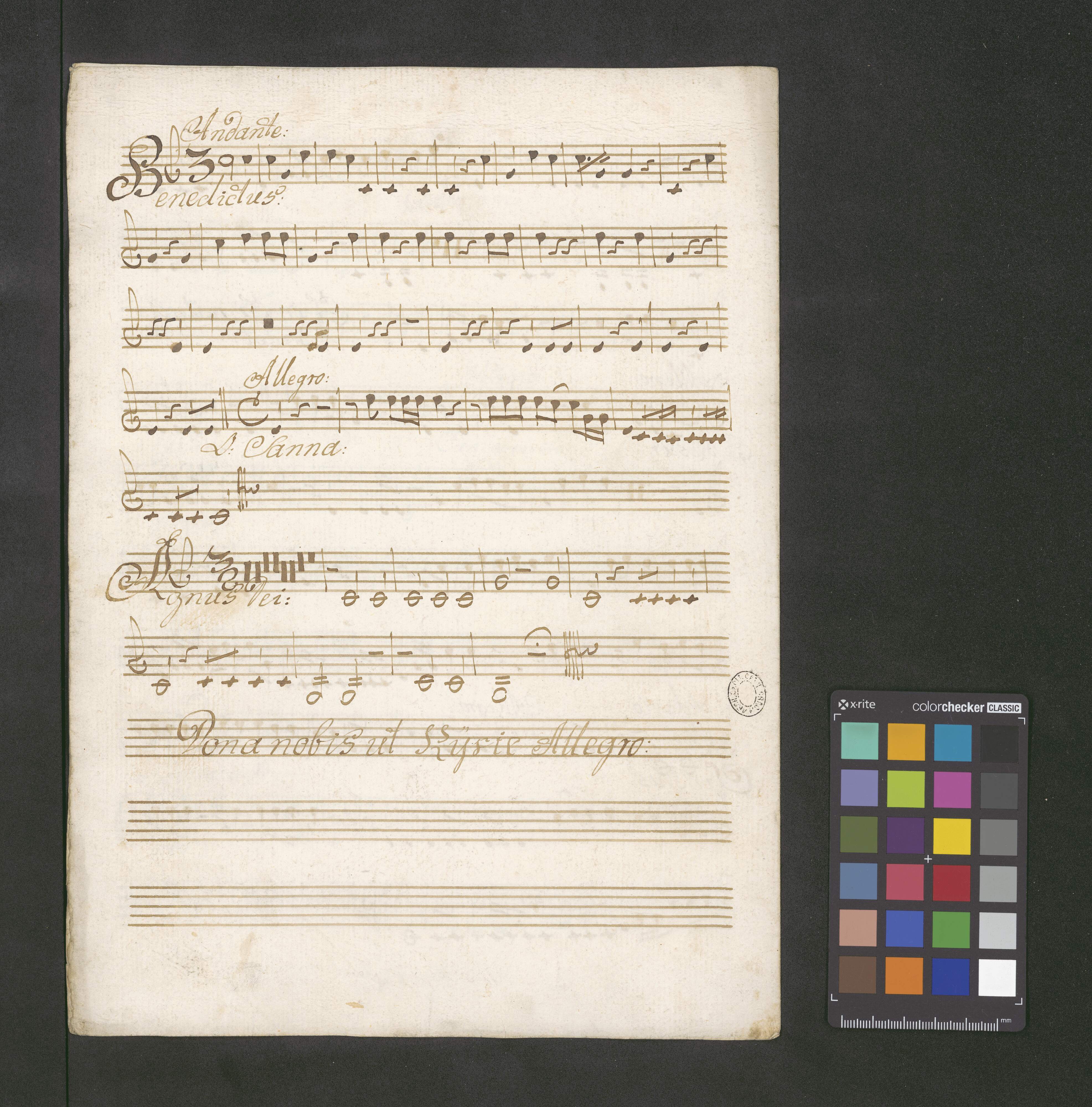 [title page:] Missa [with other hand:] "C.A.T.B. | Violinis 2bus | Obois 2bus | Clarinis 2bus | Organo et Timpano" | Authore Dem. Albrechtsberger. Ese. C. | [with other hand:] "Compavad Ao 1796 dielg Glois C Lochman Awafers awafers Musica Pnefen"
