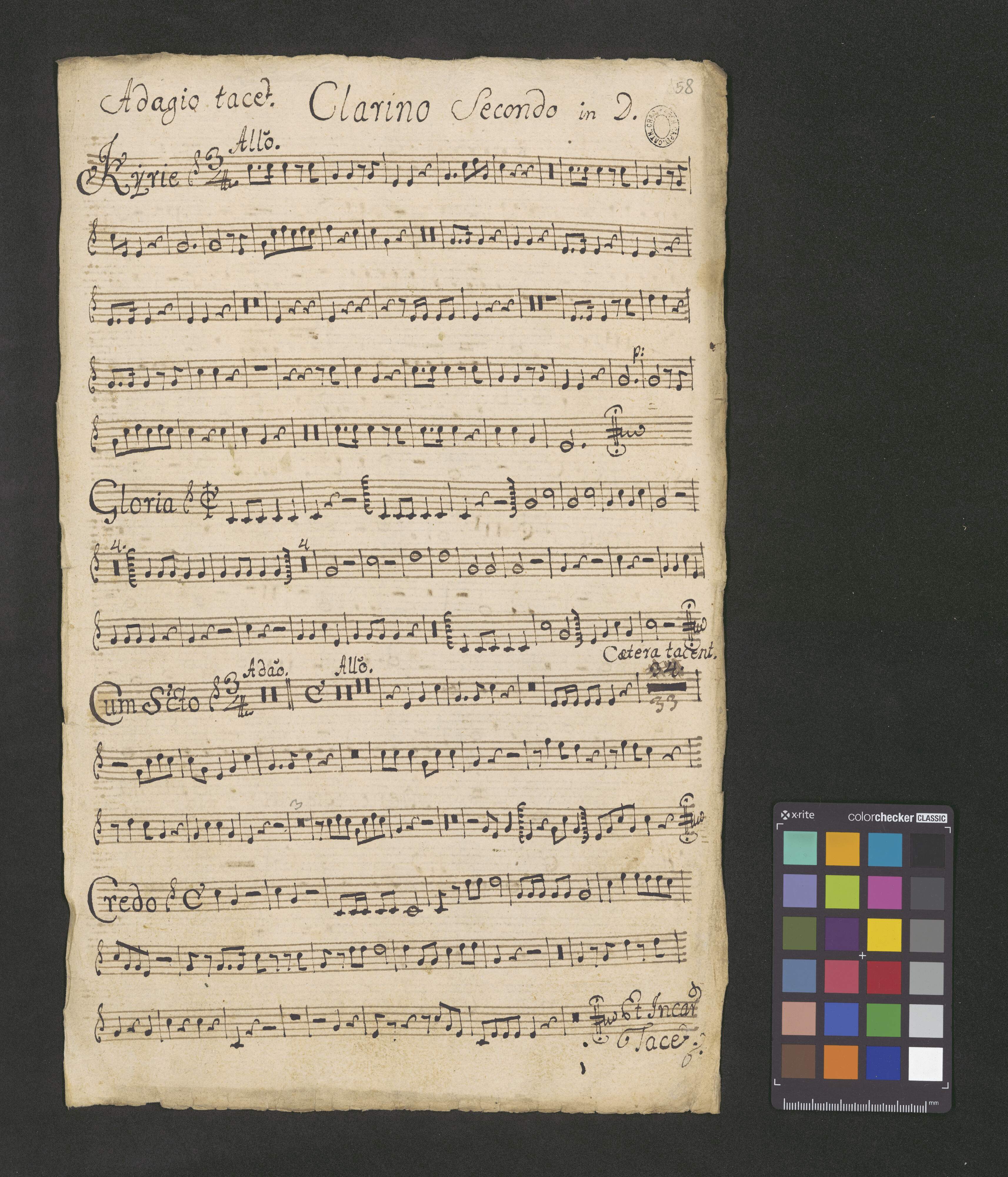[title page:] Del Segniore Benda | Missa | a. | C. A. T. B. | Violinis 2bus | Flauto Concerto | Obois 2bus | Clarivis 2bus | Violoni et Organo | [with red crayon:] N. 3