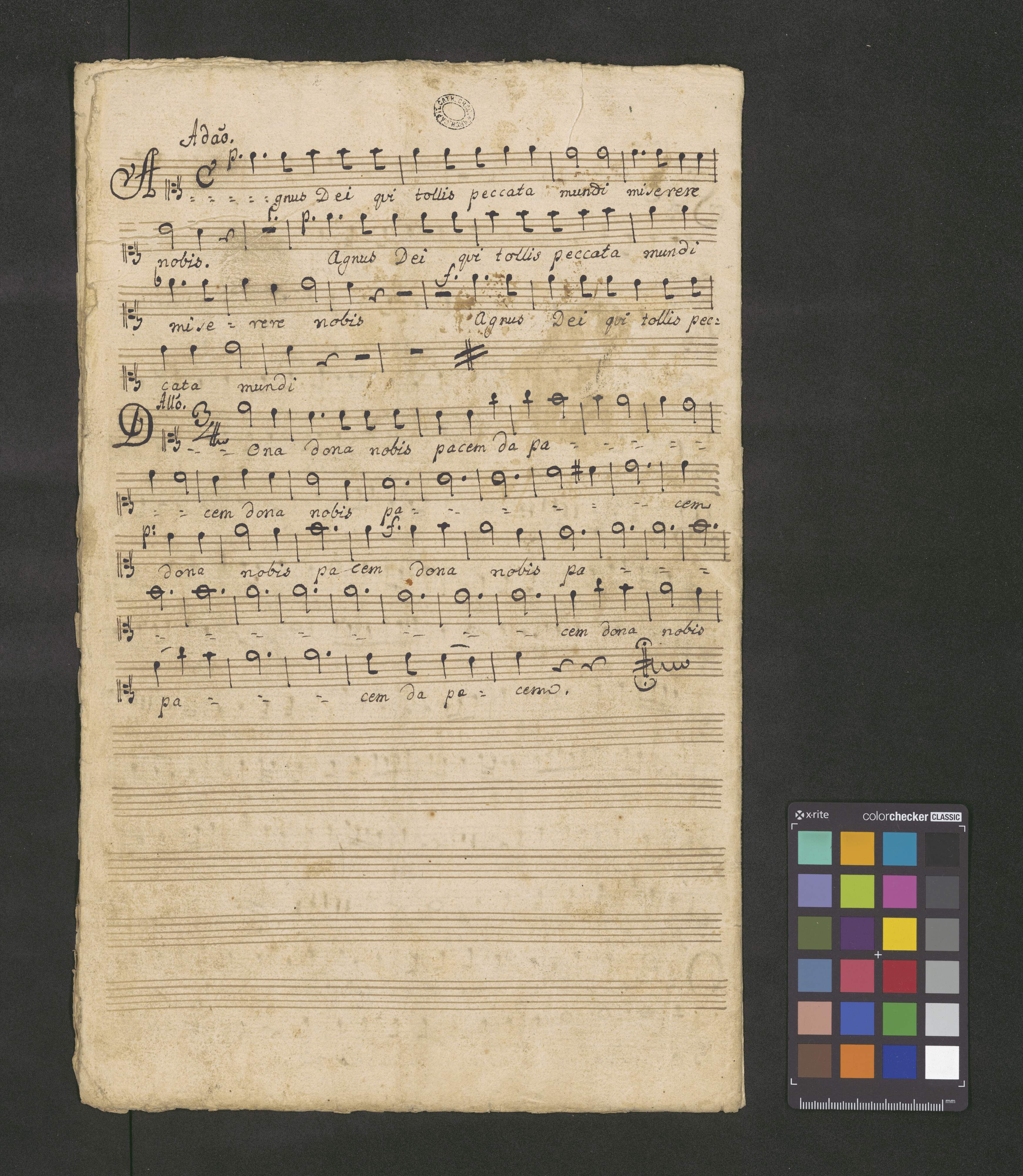 [title page:] Miſsa in C. | à | Canto, Alto, Tenore, Baſso. | Violinis 2bus, | Obois 2bus, Trombonis 2bus, Clarinis 2bus, Tympano, | Alto Viola Prima et 2da Obli | Violone Oblig | Con | Organo. | [by another hand:] Del Signiore Benda