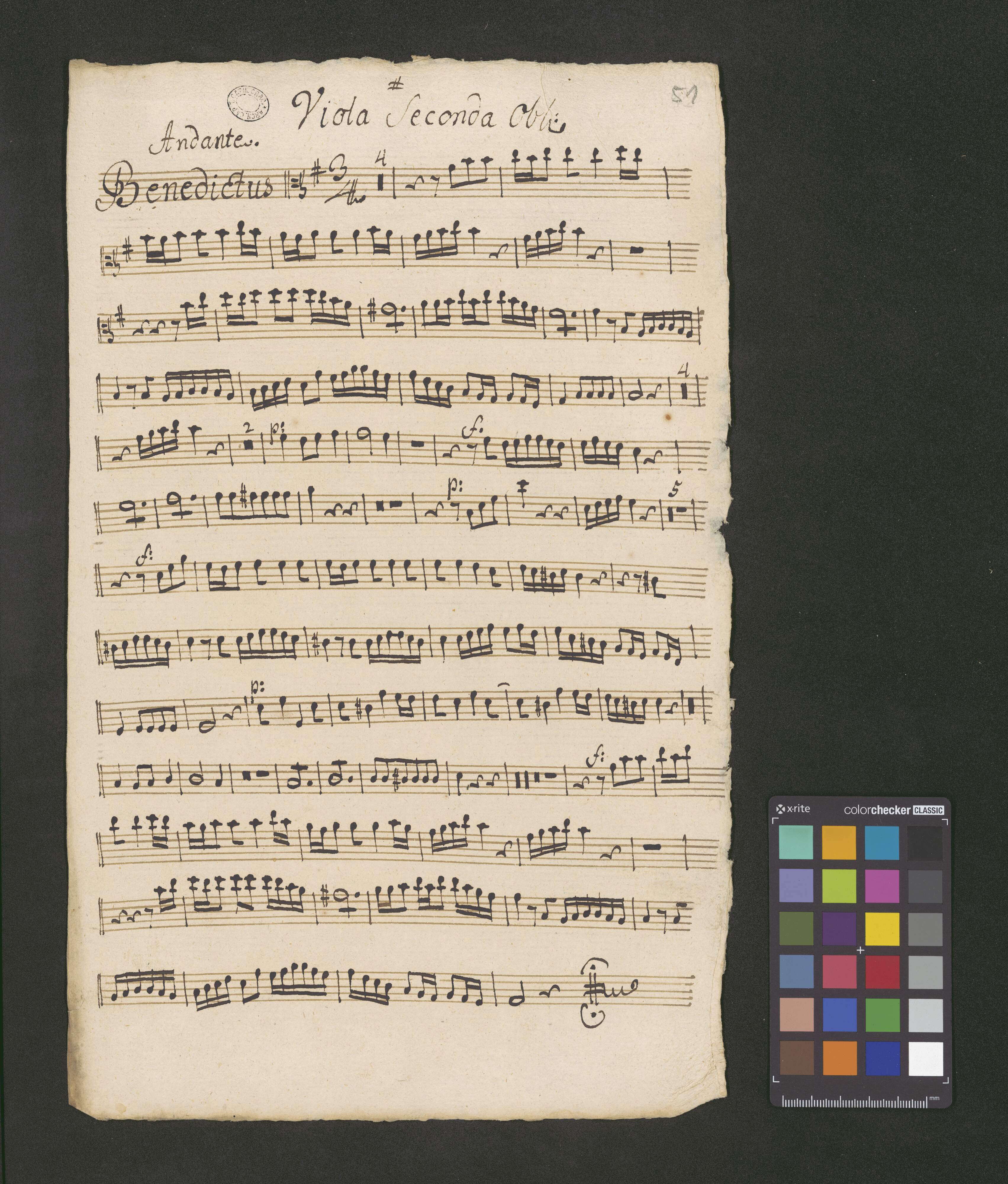 [title page:] Miſsa in C. | à | Canto, Alto, Tenore, Baſso. | Violinis 2bus, | Obois 2bus, Trombonis 2bus, Clarinis 2bus, Tympano, | Alto Viola Prima et 2da Obli | Violone Oblig | Con | Organo. | [by another hand:] Del Signiore Benda