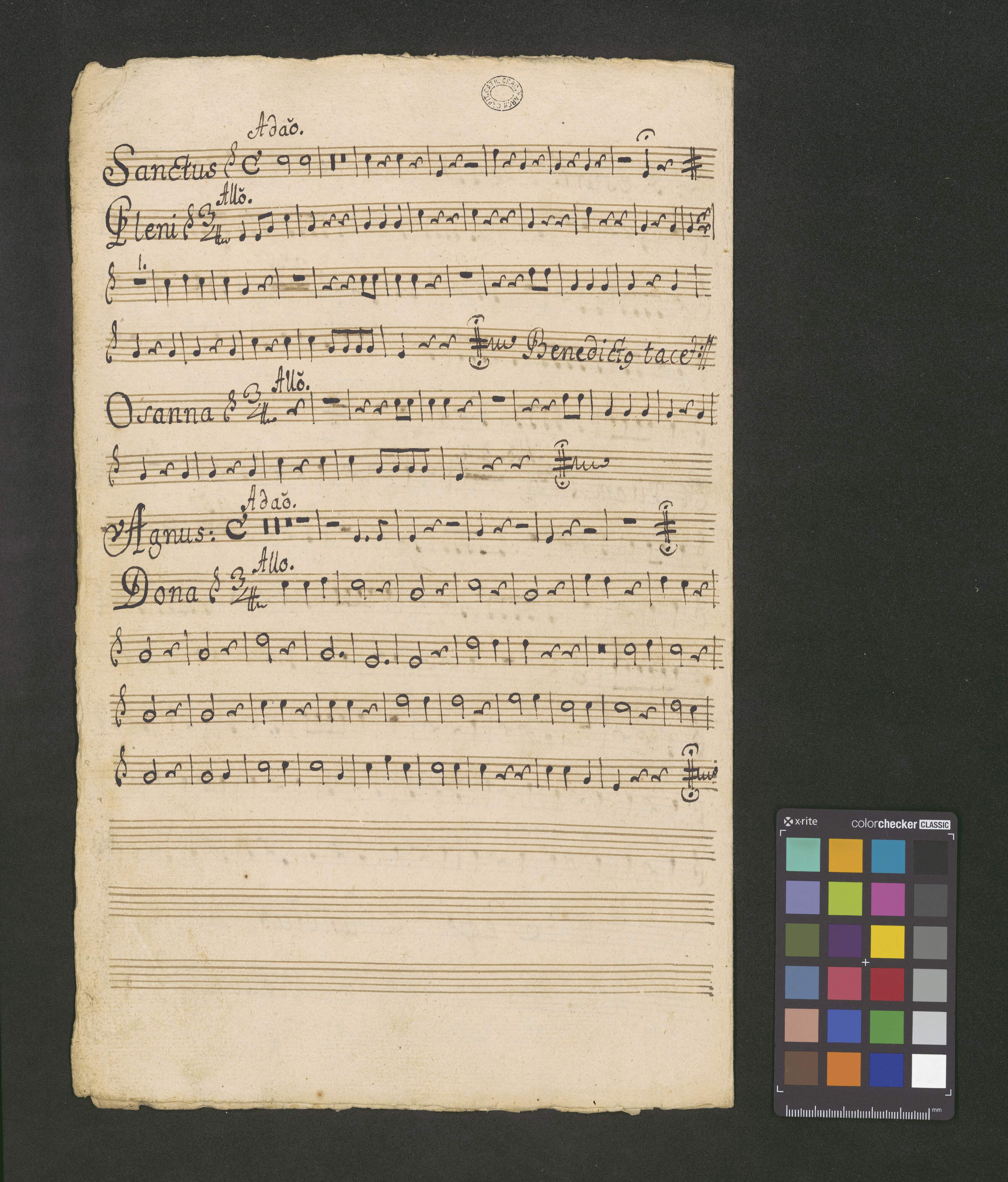 [title page:] Miſsa in C. | à | Canto, Alto, Tenore, Baſso. | Violinis 2bus, | Obois 2bus, Trombonis 2bus, Clarinis 2bus, Tympano, | Alto Viola Prima et 2da Obli | Violone Oblig | Con | Organo. | [by another hand:] Del Signiore Benda