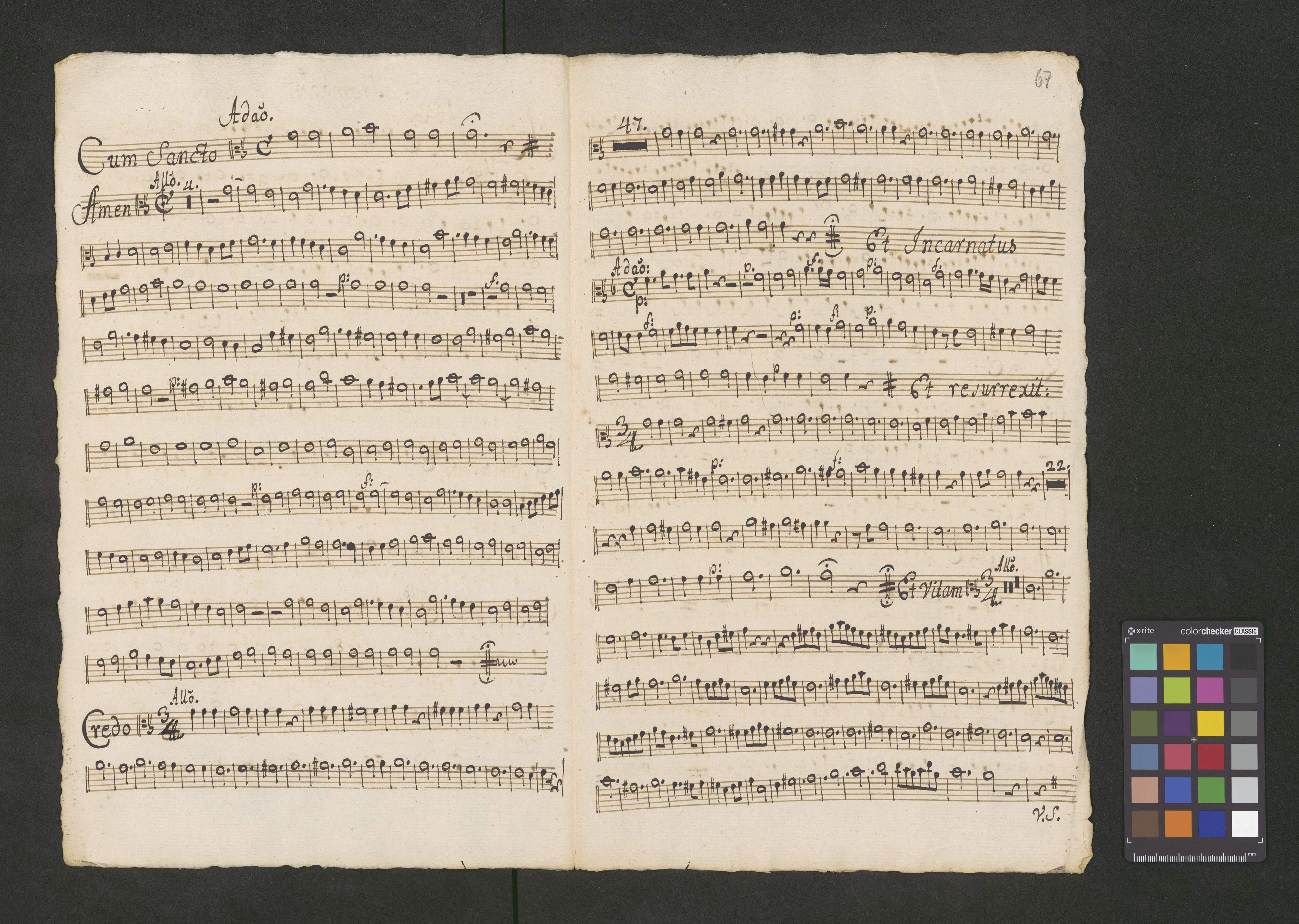 [title page:] Miſsa in C. | à | Canto, Alto, Tenore, Baſso. | Violinis 2bus, | Obois 2bus, Trombonis 2bus, Clarinis 2bus, Tympano, | Alto Viola Prima et 2da Obli | Violone Oblig | Con | Organo. | [by another hand:] Del Signiore Benda