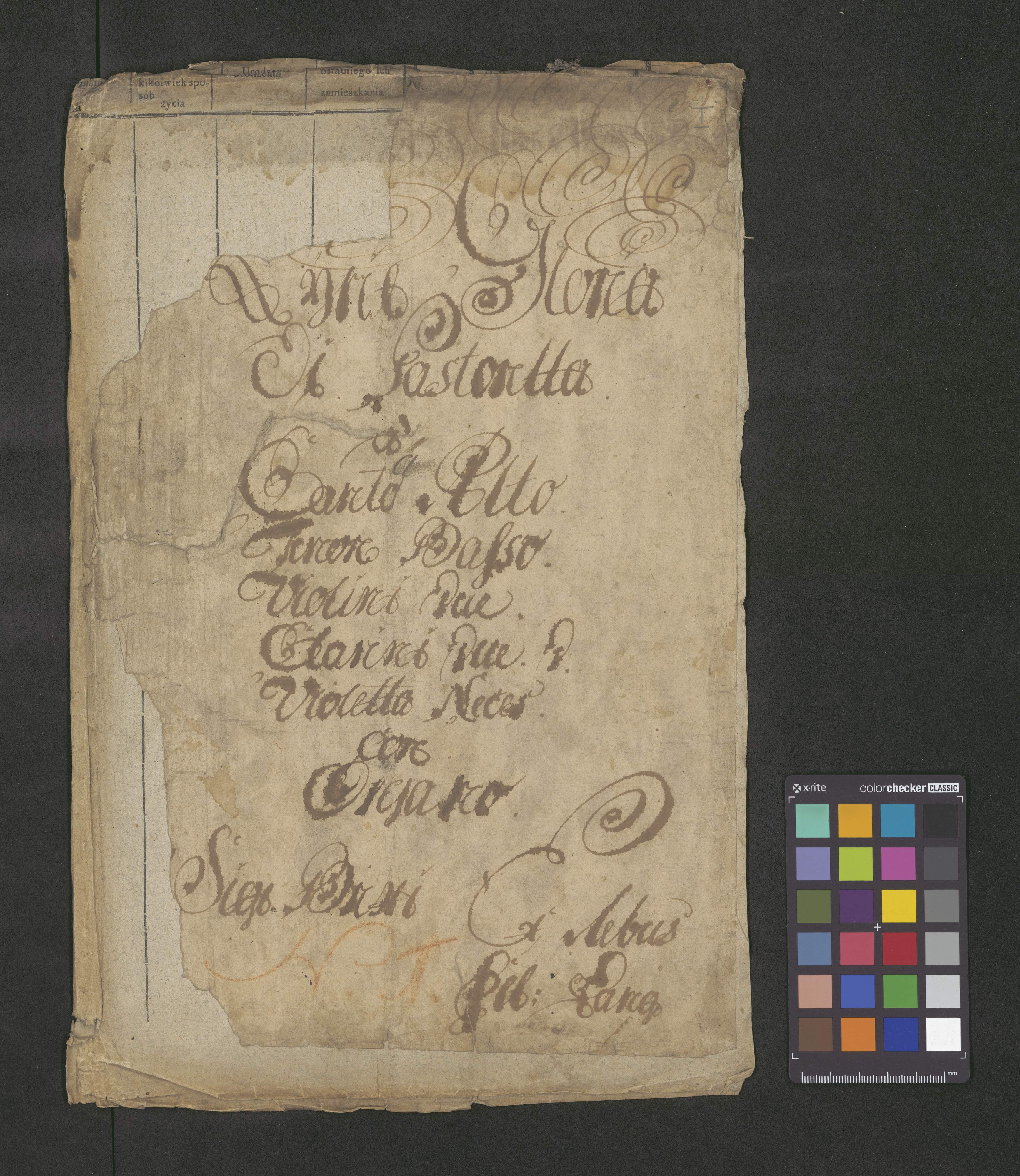 [title page:] Kyrie Gloria | di Pastorella | à | Canto Alto | Tenore Baſso. | Violini Due. | Clarini Due. D. | Violetta Neces. | con | Organo. | Sigl. Brixi Ex lebus [sic!] | Fel: Lang