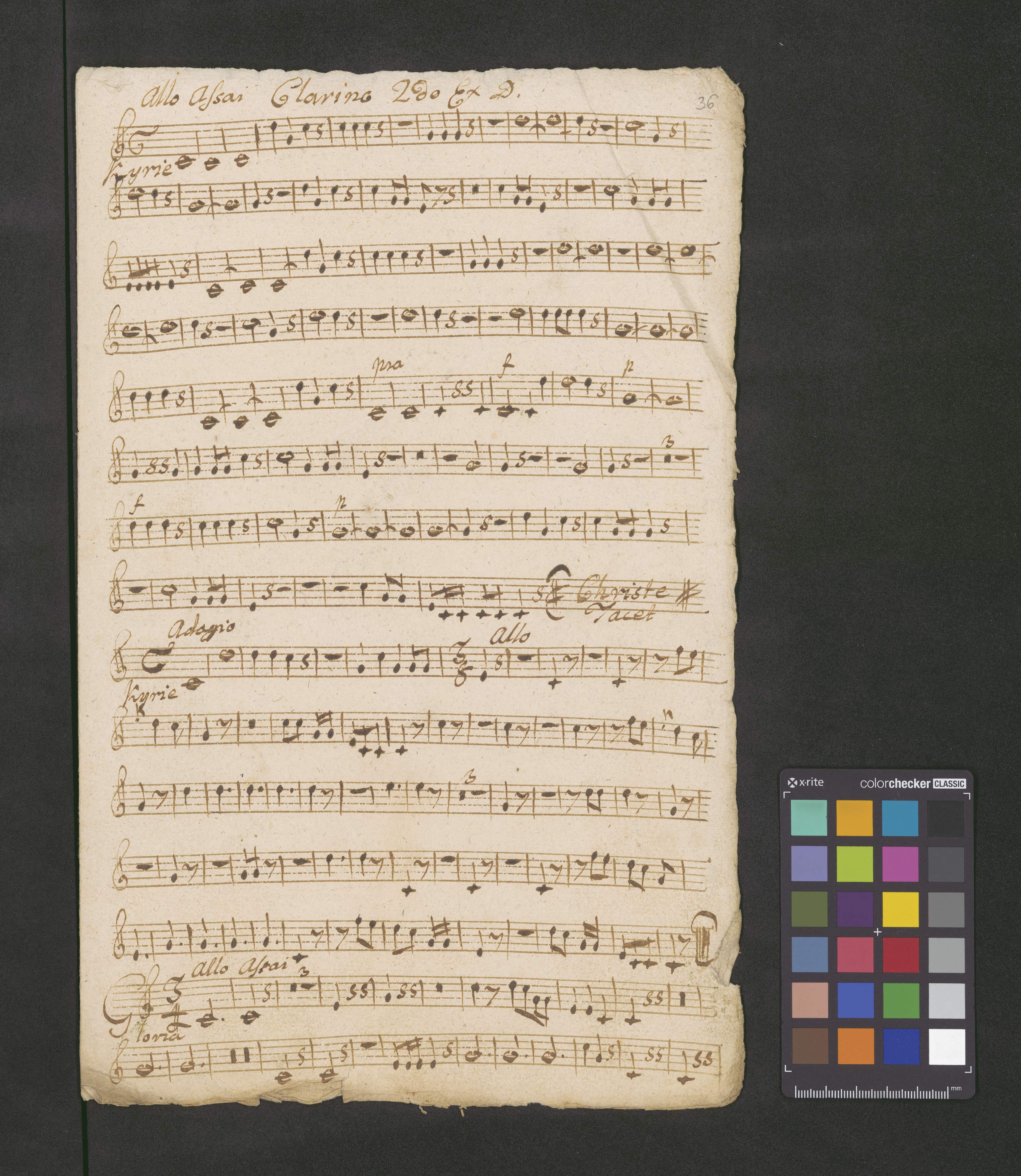 [title page:] Kirye Gloria in D. Brixi | a Vocibuſ | Canto alto | Tenore Baſso | Violinis 2bus duplicaty | Clarinis 2buſ | Violone | et | Baſso. | Pro usu Eccleie [sic!] Cathlis Crac