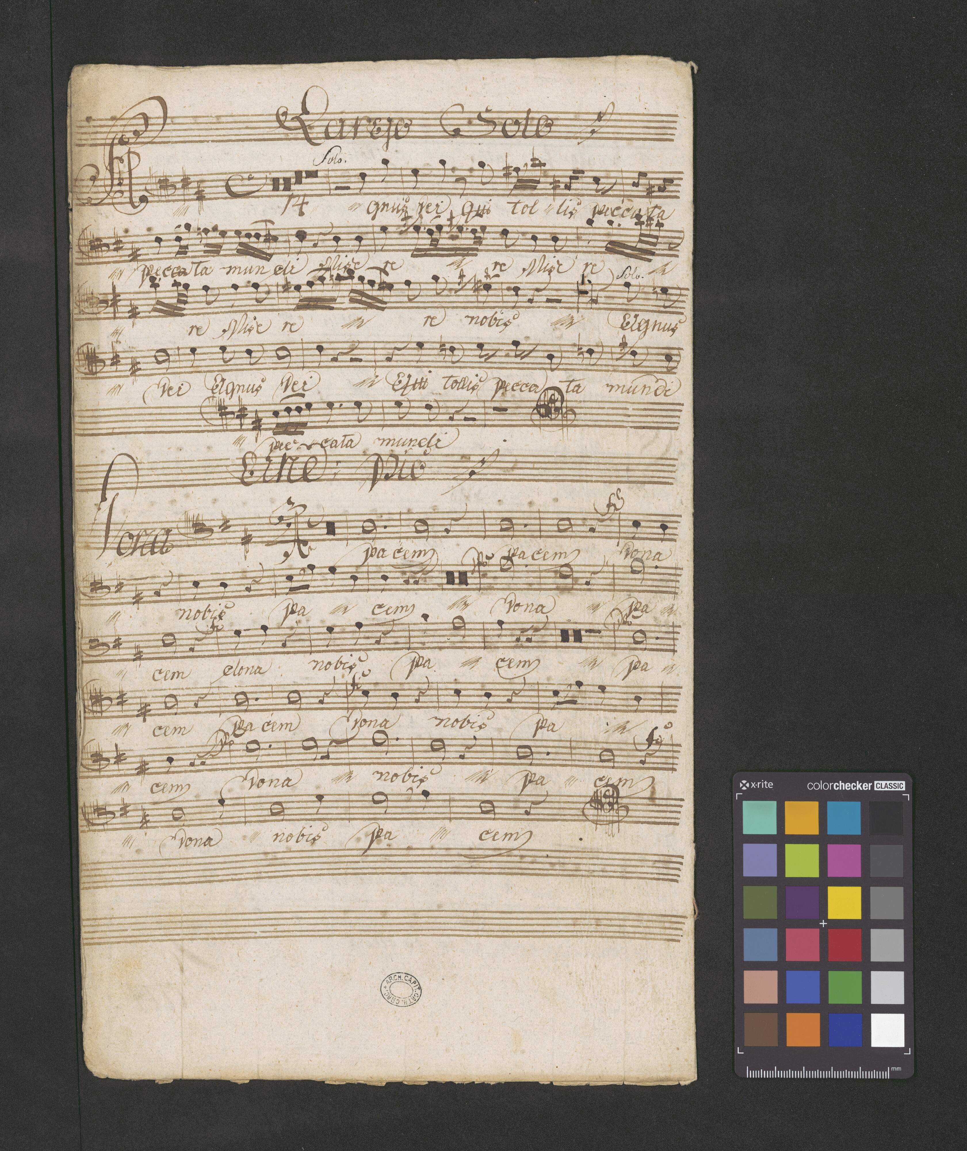 [title page:] Messa | a 4. Voci | Canto = Alto | Tenore - Baſso | Violino - 1|m|o | [right, curly bracket: duplicati] | Violino - 2.|d|o | Clarino Principale | Clarini _ Due | Tymbano [sic!] | Violone e Organo. | del Sr Brixi