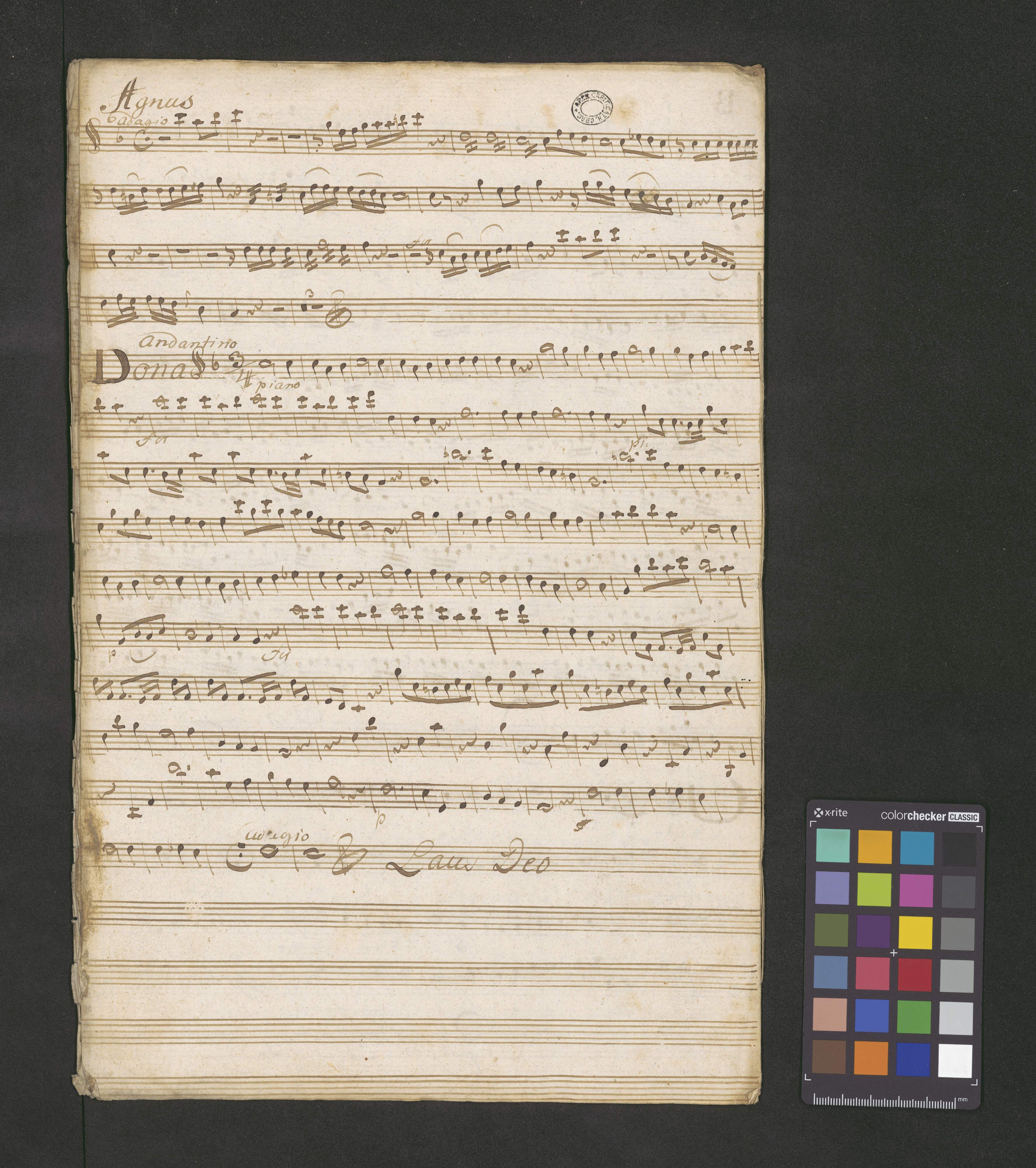 [title page:] MISSA in F.♭. | Canto. Alto. Tenore Baſso | Violinis Duobus 1|m|o duplici | Clarinis Duobus in F. | et | Organo. | Del Sign Xaverio Brizy | Ex Rebus Michailis Rychel[ſki?]