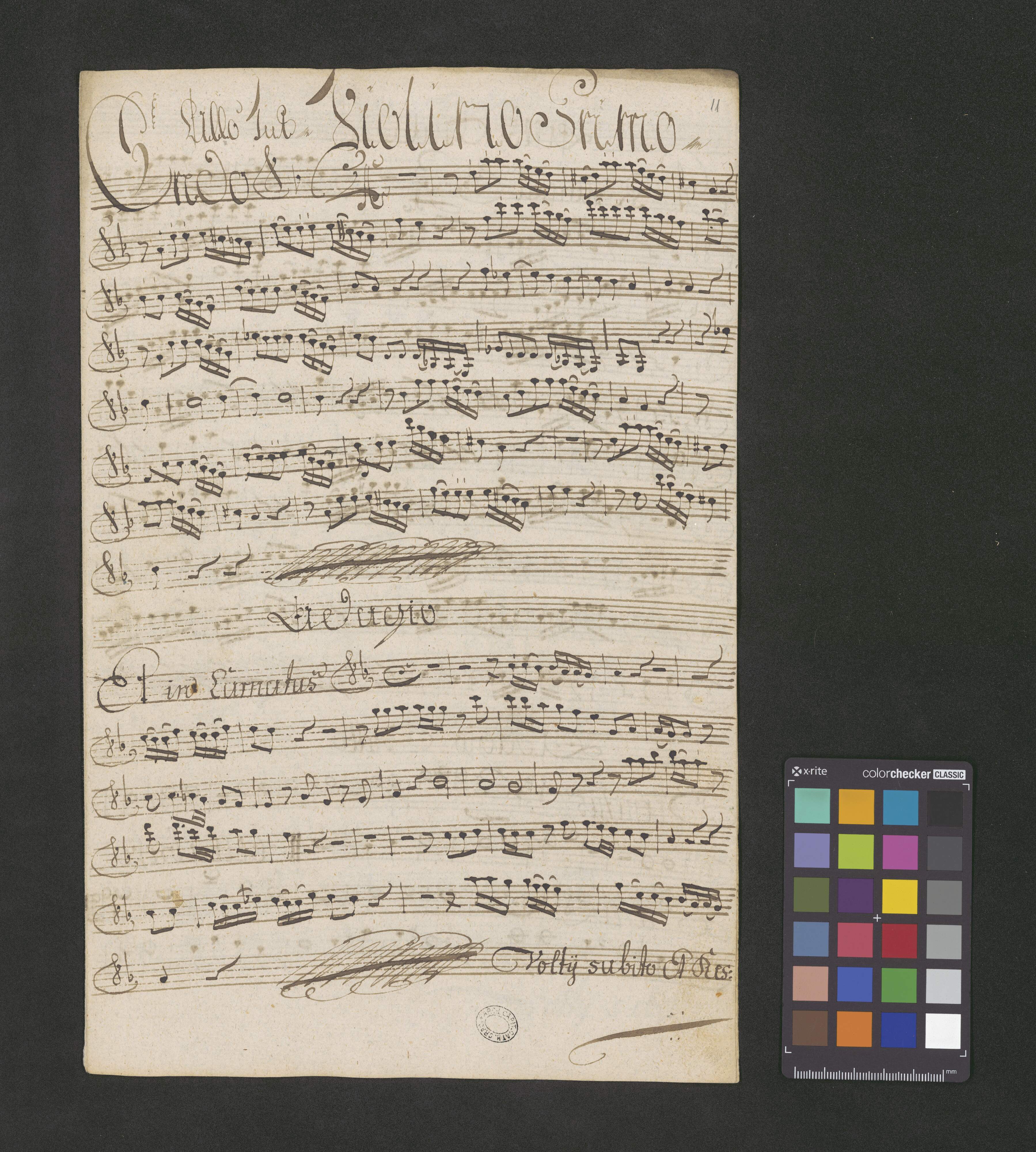 [title page:] Solenne | Credo Pulchrumque | ex | Canto Alto. | Tenore Baſso. | Violini Due | [added later in lighter ink] Flauto et Oboe due] | Cornu Due F | Violetta Neces: | con | Organo. | Del Sigl Brixi | Ex lebus [sic!] | Fel: Lang