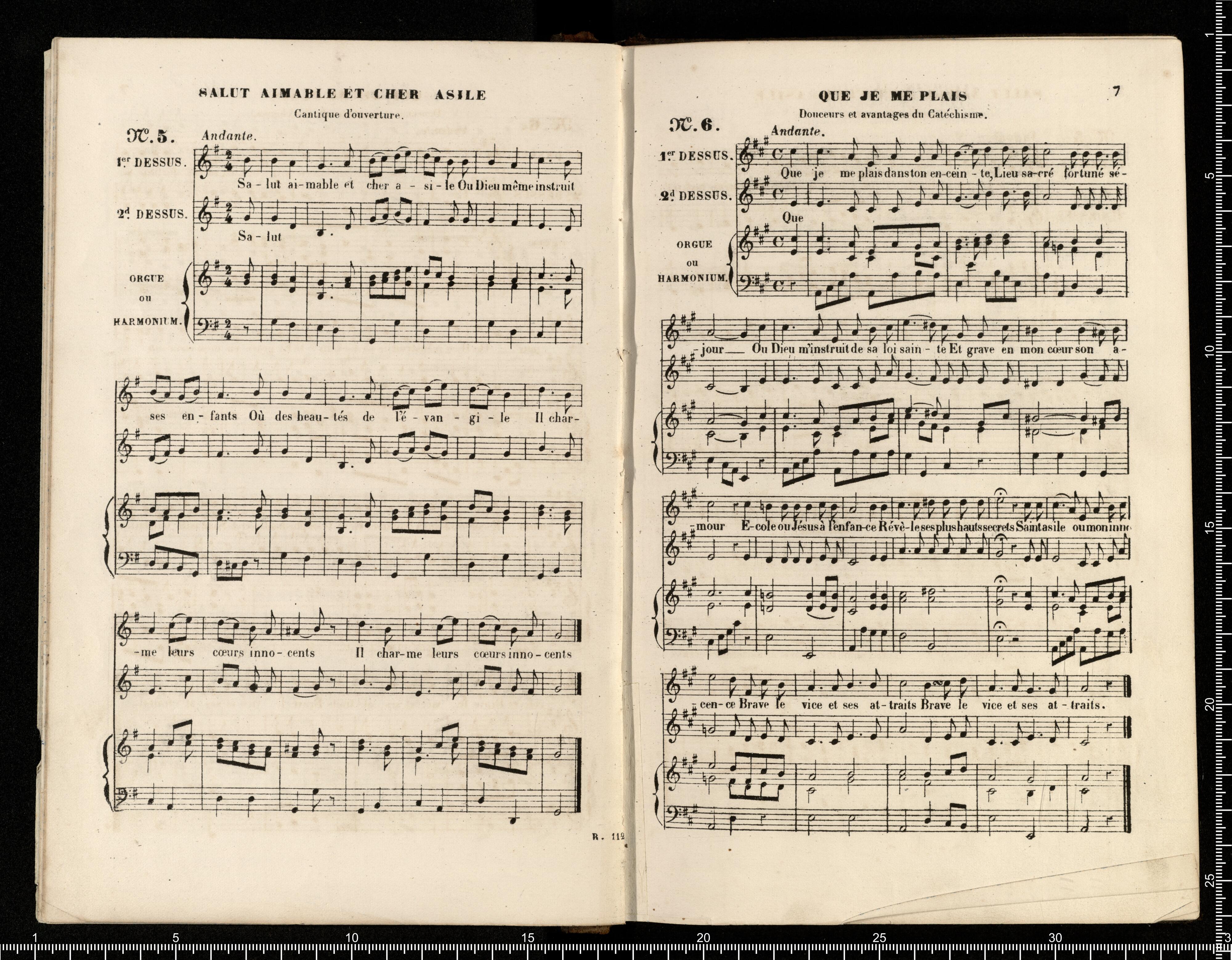 [cover - without title] [title page:] RECUEIL | DE | CANTIQUES | connus | à l'usage des Cathéchismes, | et arrangés | POUR DEUX VOIX ÉGALES | avec accompag(t). | d'Orgue ou de Piano ou d'Harmonium | PAR | L.DIETSCH | Maitre de Chapelle de l'Eglise de la Madeleine. | A.J. | Prix net: 8(F). | N(ta). Le même Recueil est aussi gravé sans accompagnement | Prix net: 2(F). | Paris, S.RICHAULT, Editeur, Boulevart Poissonnière, 26, au 1(er). | et chez M. DEVARENNES, Libraire, F(rg). S(t). Honoré, 14. | 11,267.R