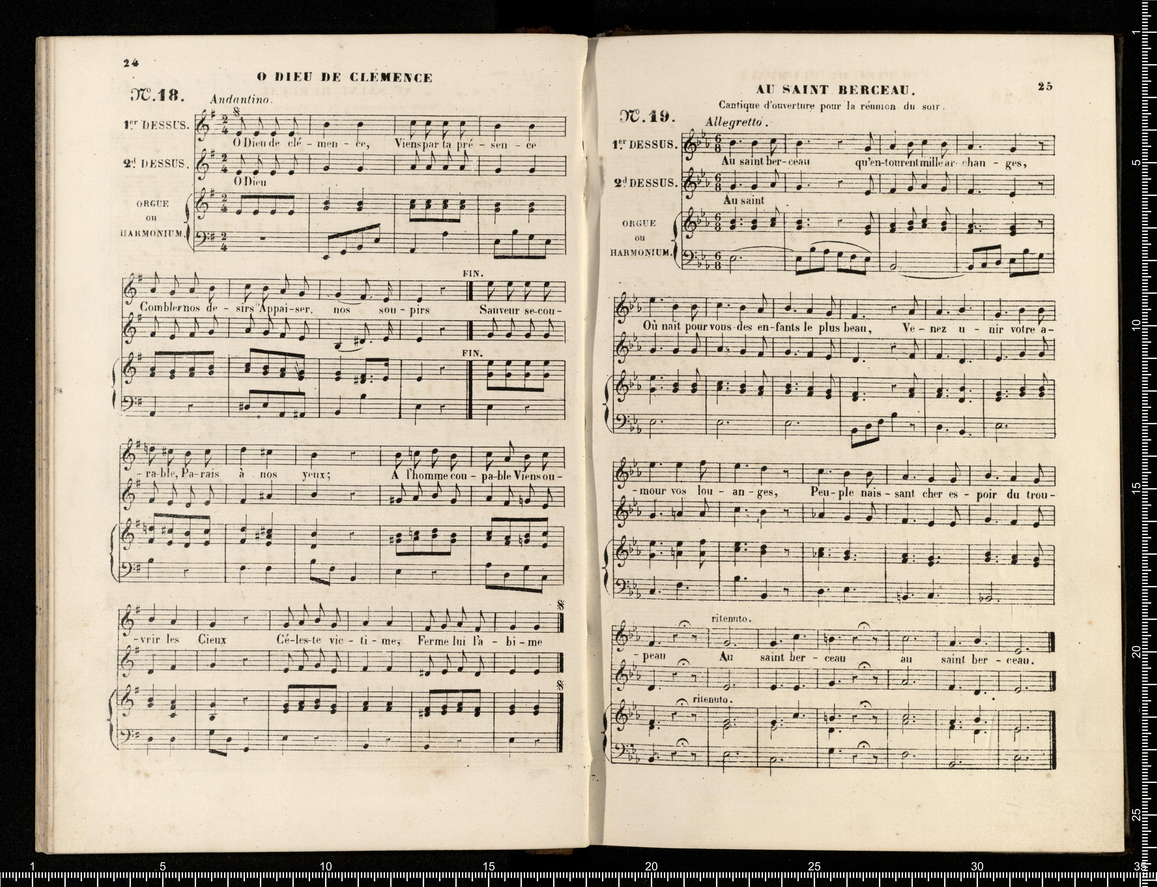 [cover - without title] [title page:] RECUEIL | DE | CANTIQUES | connus | à l'usage des Cathéchismes, | et arrangés | POUR DEUX VOIX ÉGALES | avec accompag(t). | d'Orgue ou de Piano ou d'Harmonium | PAR | L.DIETSCH | Maitre de Chapelle de l'Eglise de la Madeleine. | A.J. | Prix net: 8(F). | N(ta). Le même Recueil est aussi gravé sans accompagnement | Prix net: 2(F). | Paris, S.RICHAULT, Editeur, Boulevart Poissonnière, 26, au 1(er). | et chez M. DEVARENNES, Libraire, F(rg). S(t). Honoré, 14. | 11,267.R