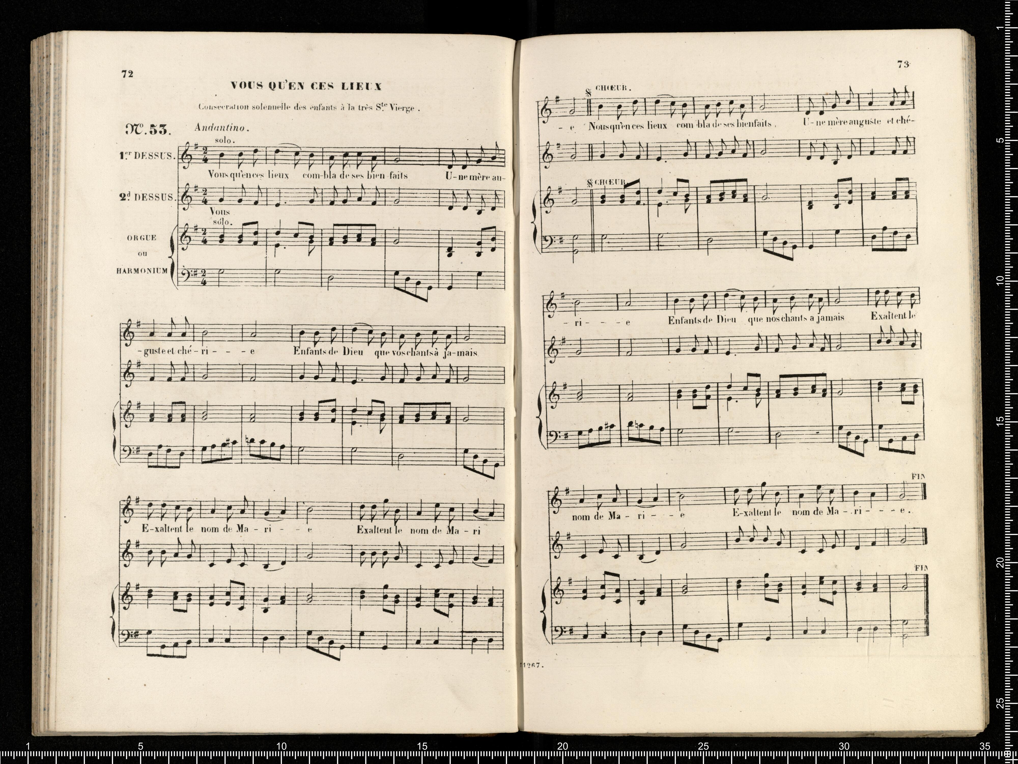 [cover - without title] [title page:] RECUEIL | DE | CANTIQUES | connus | à l'usage des Cathéchismes, | et arrangés | POUR DEUX VOIX ÉGALES | avec accompag(t). | d'Orgue ou de Piano ou d'Harmonium | PAR | L.DIETSCH | Maitre de Chapelle de l'Eglise de la Madeleine. | A.J. | Prix net: 8(F). | N(ta). Le même Recueil est aussi gravé sans accompagnement | Prix net: 2(F). | Paris, S.RICHAULT, Editeur, Boulevart Poissonnière, 26, au 1(er). | et chez M. DEVARENNES, Libraire, F(rg). S(t). Honoré, 14. | 11,267.R