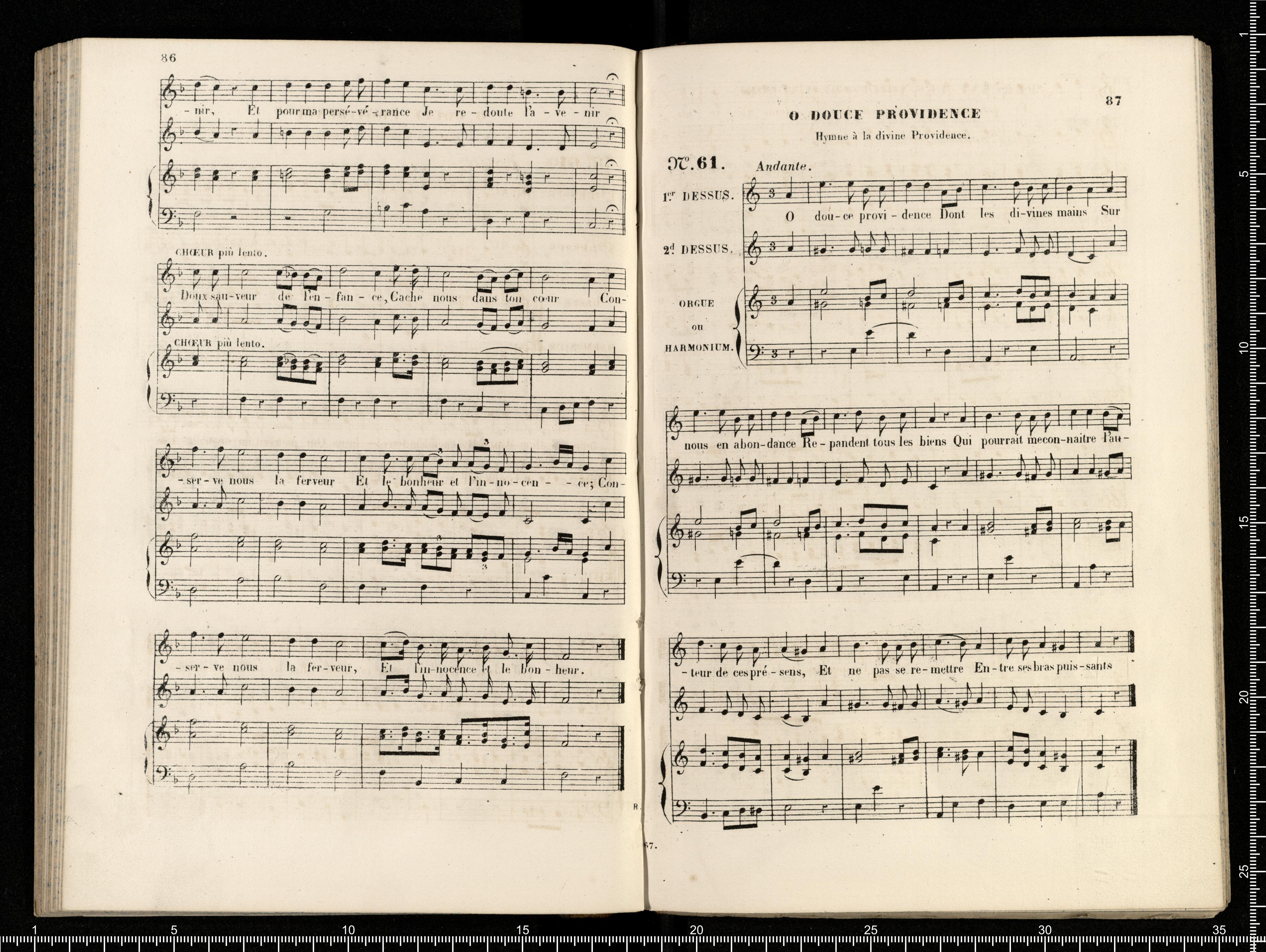 [cover - without title] [title page:] RECUEIL | DE | CANTIQUES | connus | à l'usage des Cathéchismes, | et arrangés | POUR DEUX VOIX ÉGALES | avec accompag(t). | d'Orgue ou de Piano ou d'Harmonium | PAR | L.DIETSCH | Maitre de Chapelle de l'Eglise de la Madeleine. | A.J. | Prix net: 8(F). | N(ta). Le même Recueil est aussi gravé sans accompagnement | Prix net: 2(F). | Paris, S.RICHAULT, Editeur, Boulevart Poissonnière, 26, au 1(er). | et chez M. DEVARENNES, Libraire, F(rg). S(t). Honoré, 14. | 11,267.R
