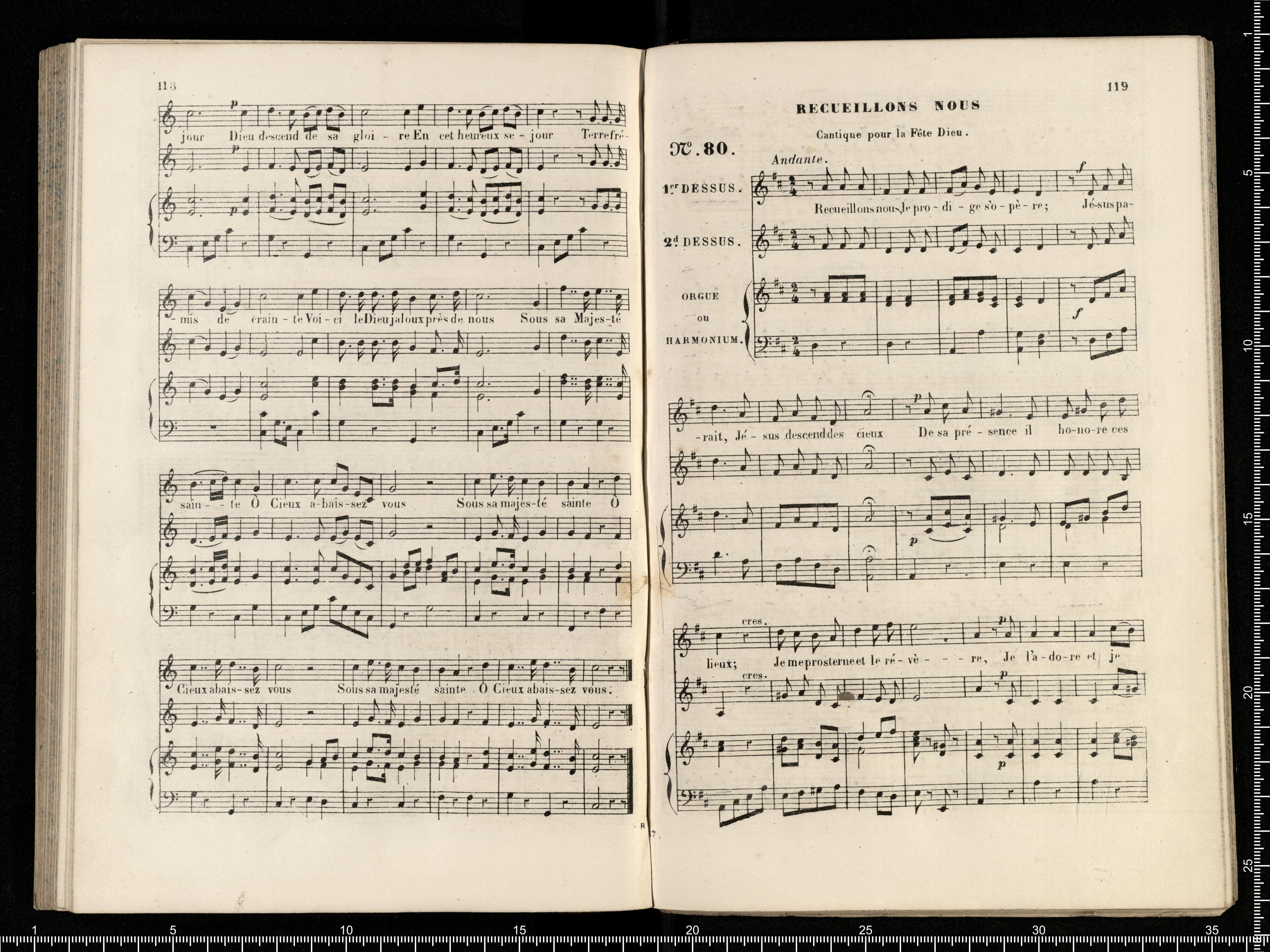 [cover - without title] [title page:] RECUEIL | DE | CANTIQUES | connus | à l'usage des Cathéchismes, | et arrangés | POUR DEUX VOIX ÉGALES | avec accompag(t). | d'Orgue ou de Piano ou d'Harmonium | PAR | L.DIETSCH | Maitre de Chapelle de l'Eglise de la Madeleine. | A.J. | Prix net: 8(F). | N(ta). Le même Recueil est aussi gravé sans accompagnement | Prix net: 2(F). | Paris, S.RICHAULT, Editeur, Boulevart Poissonnière, 26, au 1(er). | et chez M. DEVARENNES, Libraire, F(rg). S(t). Honoré, 14. | 11,267.R