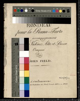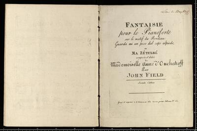[1st title page, p. 1:] RONDEAU | pour le Piano-Forte | avec accompagnement | De Deux Violons, Alto et Basse | Composé | Par | JOHN FIELD. | À S|T. PÉTERSBOURG. | Chez DALMAS, Editeur du Troubadour du Nord, Grande Millionne N|o 43, [2nd title page, p. 15:] FANTAISIE | pour le Pianoforte | sur le motif du Rondéau: | Guarda mi un poco dal capo alpiede, | ou | MA ZÉTULBÉ | composée et dédiée | à | Mademoiselle Anne d'Ouchakoff | Par | JOHN FIELD | Seconde Edition | Gravé et imprimé à S|T. PÉTÉRSBOURG chez DALMAS grande Millionne N|o 43, 2 Instrumental pieces pf
