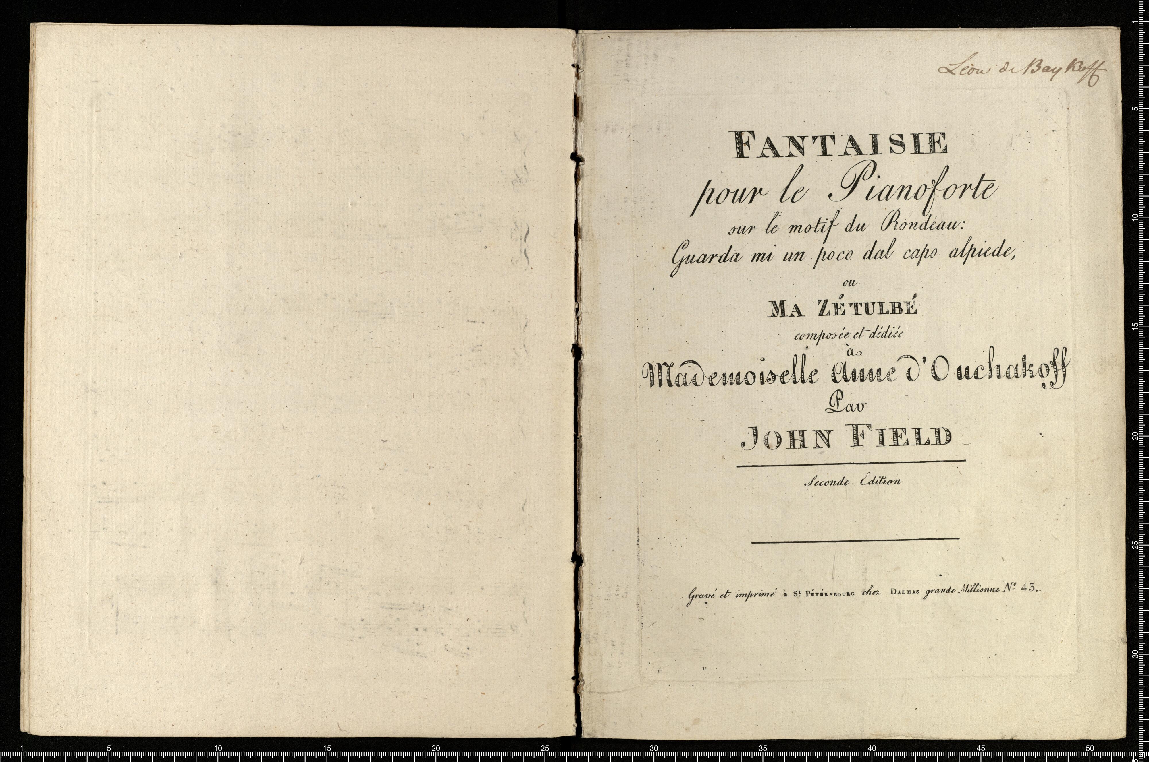 [1st title page, p. 1:] RONDEAU | pour le Piano-Forte | avec accompagnement | De Deux Violons, Alto et Basse | Composé | Par | JOHN FIELD. | À S|T. PÉTERSBOURG. | Chez DALMAS, Editeur du Troubadour du Nord, Grande Millionne N|o 43