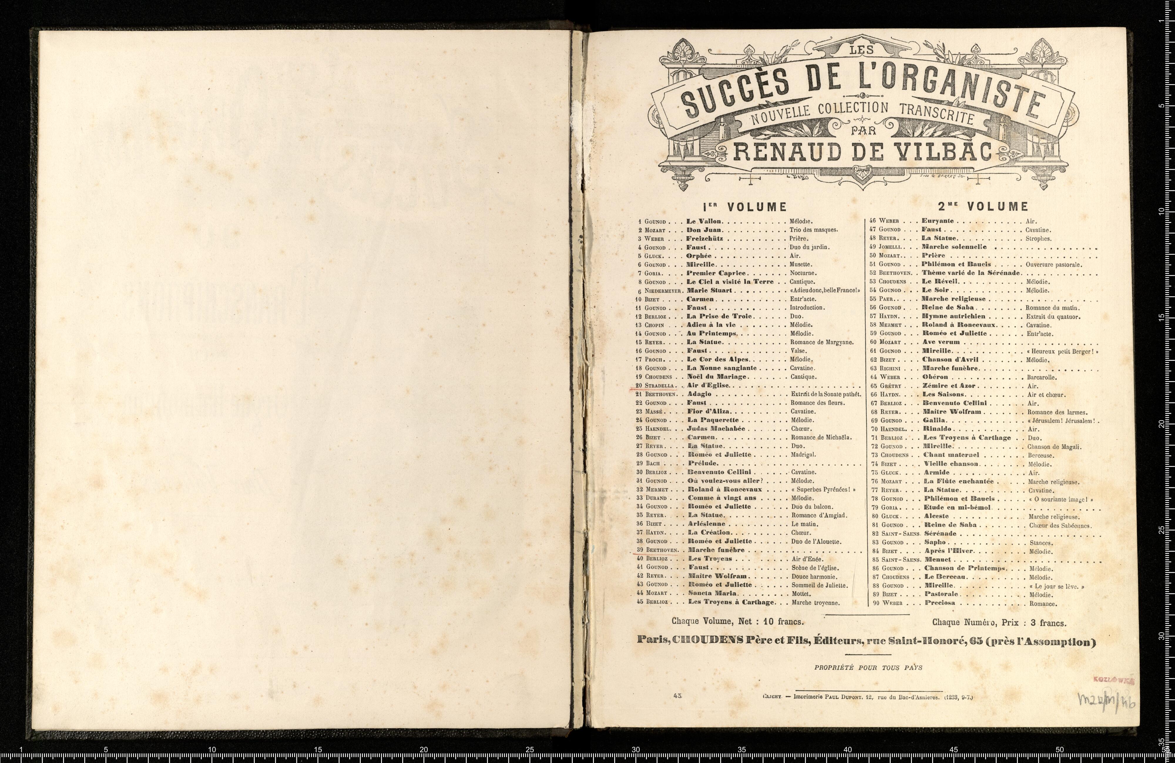 Les 2(eme),, Edition | Succès de l'Organiste | 90 | Transcriptions | POUR | Orgue-Harmonium | en Deux Volumes | Chaque Volume. net.: 10(F). | Paris, CHOUDENS Père & Fils, Editeurs, 265, Rue S(t).Honoré (Pres l'Assomption.) | Pripriété pour tous Pays