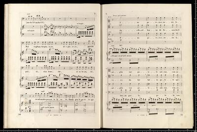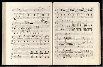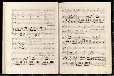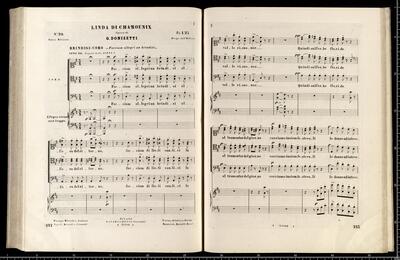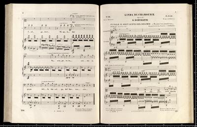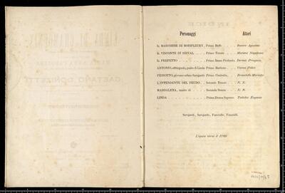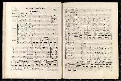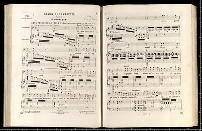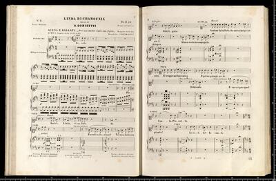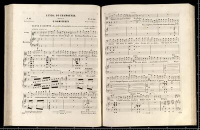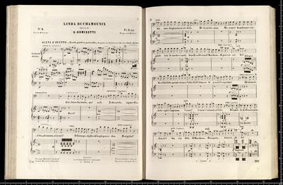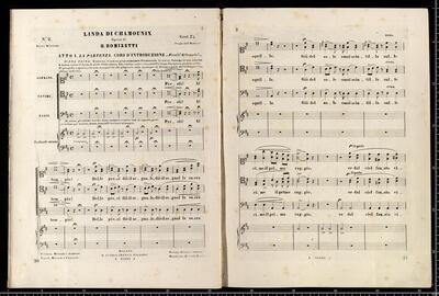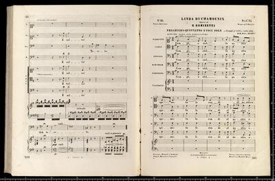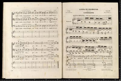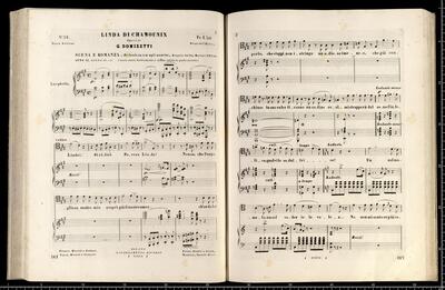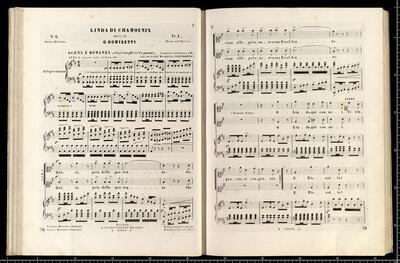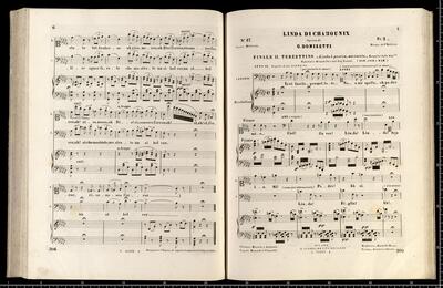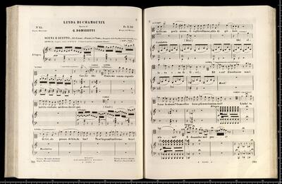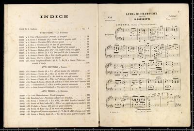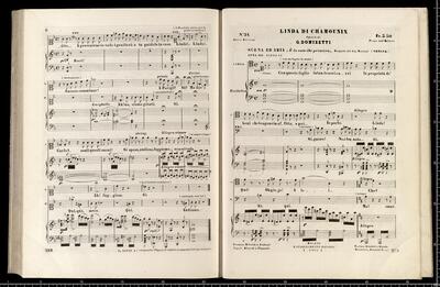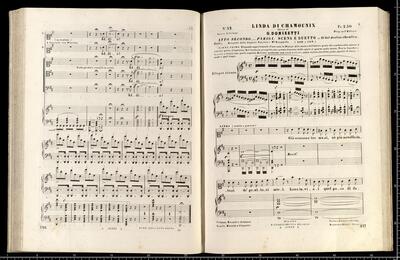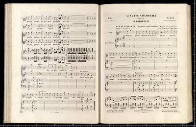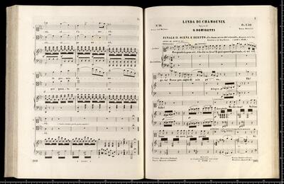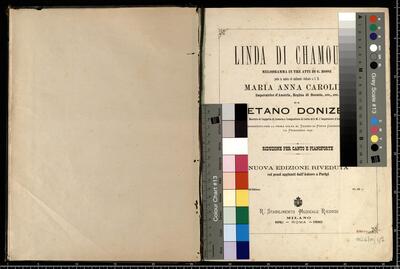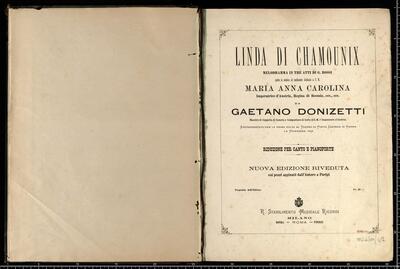 [cover - without title] [title page:] LINDA DI CHAMOUNIX | MELODRAMMA IN TRE ATTI DI G. ROSSI | posto in musica ed umilimente dedicato a S. M. | MARIA ANNA CAROLINA | Imperatrice d'Austria, Regina di Boemia, ecc., ecc. | DA | GAETANO DONIZETTI | Maestro di Cappella di Camera e Compisitore di Corte di S. M. l'Omperatore d'Austria. | RAPPRENENTATO PER LA PRIMA VOLTA AL TEATRO DI PORTA CARINZIA IN VIENNA | LA PRIMAVERA 1842 | RIDUZIONE PER CANTO E PIANOFORTE | NUOVA EDIZIONE RIVEDUTA | coi pezzi aggiunti dall'Autore a Parigi | Proprietà dell'Editore Fr. 36 - | R. Stabilimento Musicale Ricordi | MILANO | NAPOLI - ROMA - FIRENZE, Linda di Chamounix V (8), pf Arr