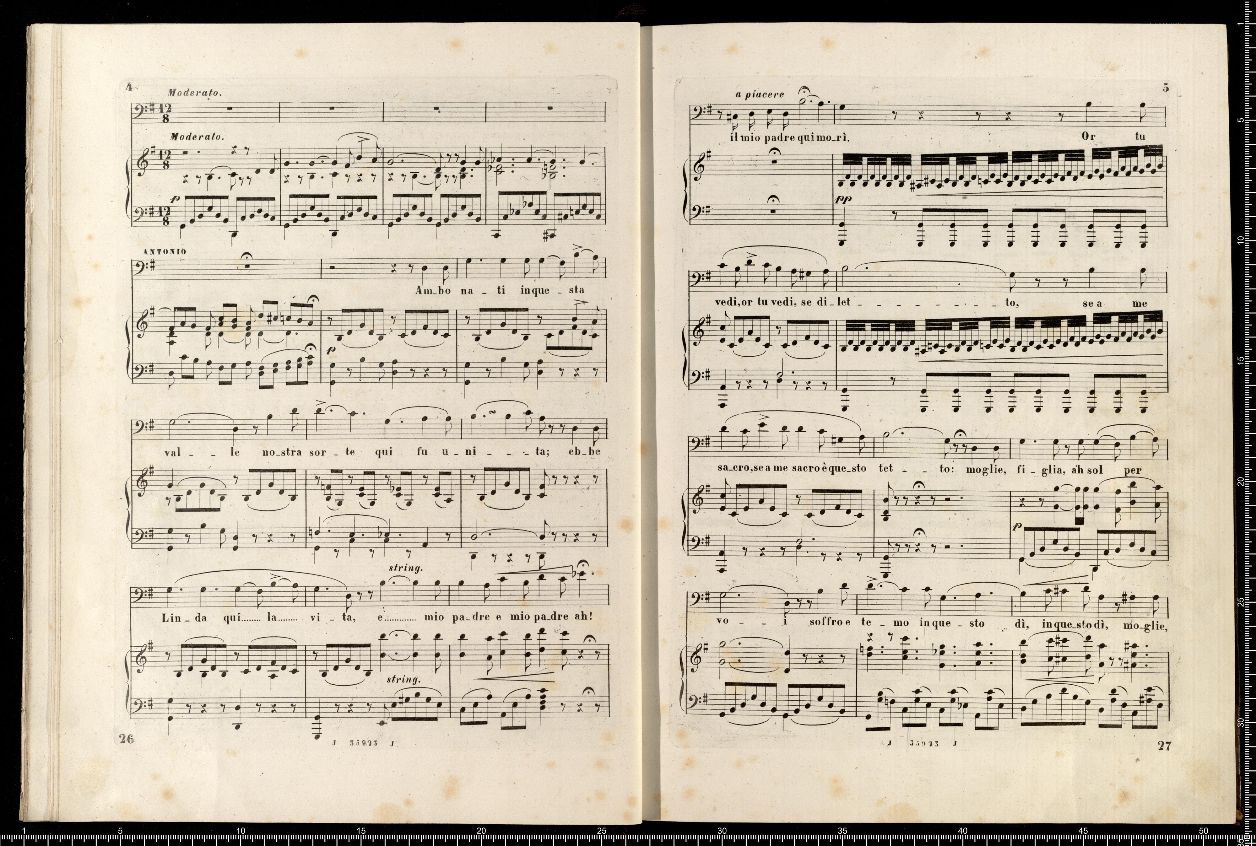 [cover - without title] [title page:] LINDA DI CHAMOUNIX | MELODRAMMA IN TRE ATTI DI G. ROSSI | posto in musica ed umilimente dedicato a S. M. | MARIA ANNA CAROLINA | Imperatrice d'Austria, Regina di Boemia, ecc., ecc. | DA | GAETANO DONIZETTI | Maestro di Cappella di Camera e Compisitore di Corte di S. M. l'Omperatore d'Austria. | RAPPRENENTATO PER LA PRIMA VOLTA AL TEATRO DI PORTA CARINZIA IN VIENNA | LA PRIMAVERA 1842 | RIDUZIONE PER CANTO E PIANOFORTE | NUOVA EDIZIONE RIVEDUTA | coi pezzi aggiunti dall'Autore a Parigi | Proprietà dell'Editore Fr. 36 - | R. Stabilimento Musicale Ricordi | MILANO | NAPOLI - ROMA - FIRENZE