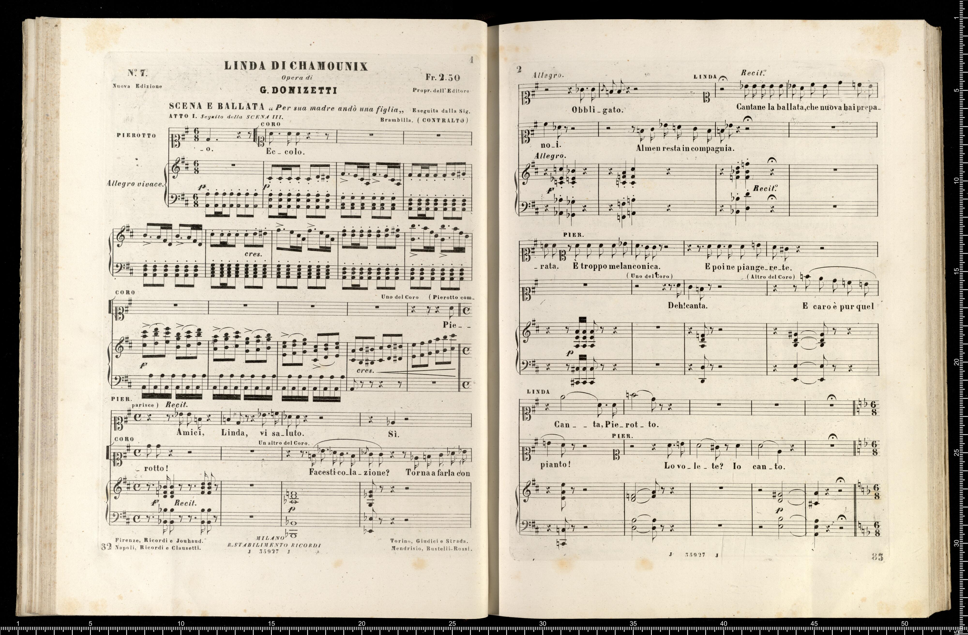 [cover - without title] [title page:] LINDA DI CHAMOUNIX | MELODRAMMA IN TRE ATTI DI G. ROSSI | posto in musica ed umilimente dedicato a S. M. | MARIA ANNA CAROLINA | Imperatrice d'Austria, Regina di Boemia, ecc., ecc. | DA | GAETANO DONIZETTI | Maestro di Cappella di Camera e Compisitore di Corte di S. M. l'Omperatore d'Austria. | RAPPRENENTATO PER LA PRIMA VOLTA AL TEATRO DI PORTA CARINZIA IN VIENNA | LA PRIMAVERA 1842 | RIDUZIONE PER CANTO E PIANOFORTE | NUOVA EDIZIONE RIVEDUTA | coi pezzi aggiunti dall'Autore a Parigi | Proprietà dell'Editore Fr. 36 - | R. Stabilimento Musicale Ricordi | MILANO | NAPOLI - ROMA - FIRENZE