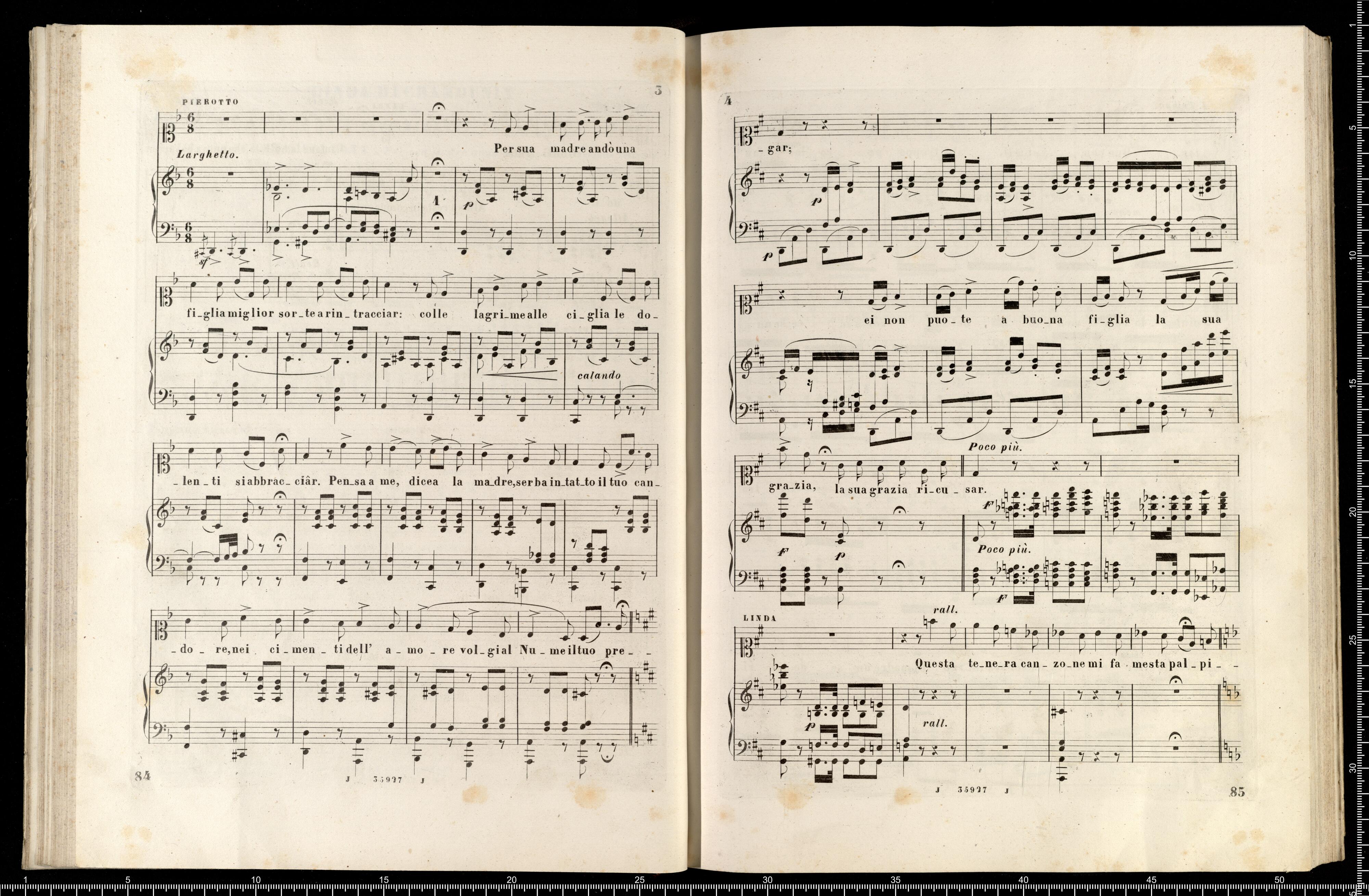 [cover - without title] [title page:] LINDA DI CHAMOUNIX | MELODRAMMA IN TRE ATTI DI G. ROSSI | posto in musica ed umilimente dedicato a S. M. | MARIA ANNA CAROLINA | Imperatrice d'Austria, Regina di Boemia, ecc., ecc. | DA | GAETANO DONIZETTI | Maestro di Cappella di Camera e Compisitore di Corte di S. M. l'Omperatore d'Austria. | RAPPRENENTATO PER LA PRIMA VOLTA AL TEATRO DI PORTA CARINZIA IN VIENNA | LA PRIMAVERA 1842 | RIDUZIONE PER CANTO E PIANOFORTE | NUOVA EDIZIONE RIVEDUTA | coi pezzi aggiunti dall'Autore a Parigi | Proprietà dell'Editore Fr. 36 - | R. Stabilimento Musicale Ricordi | MILANO | NAPOLI - ROMA - FIRENZE