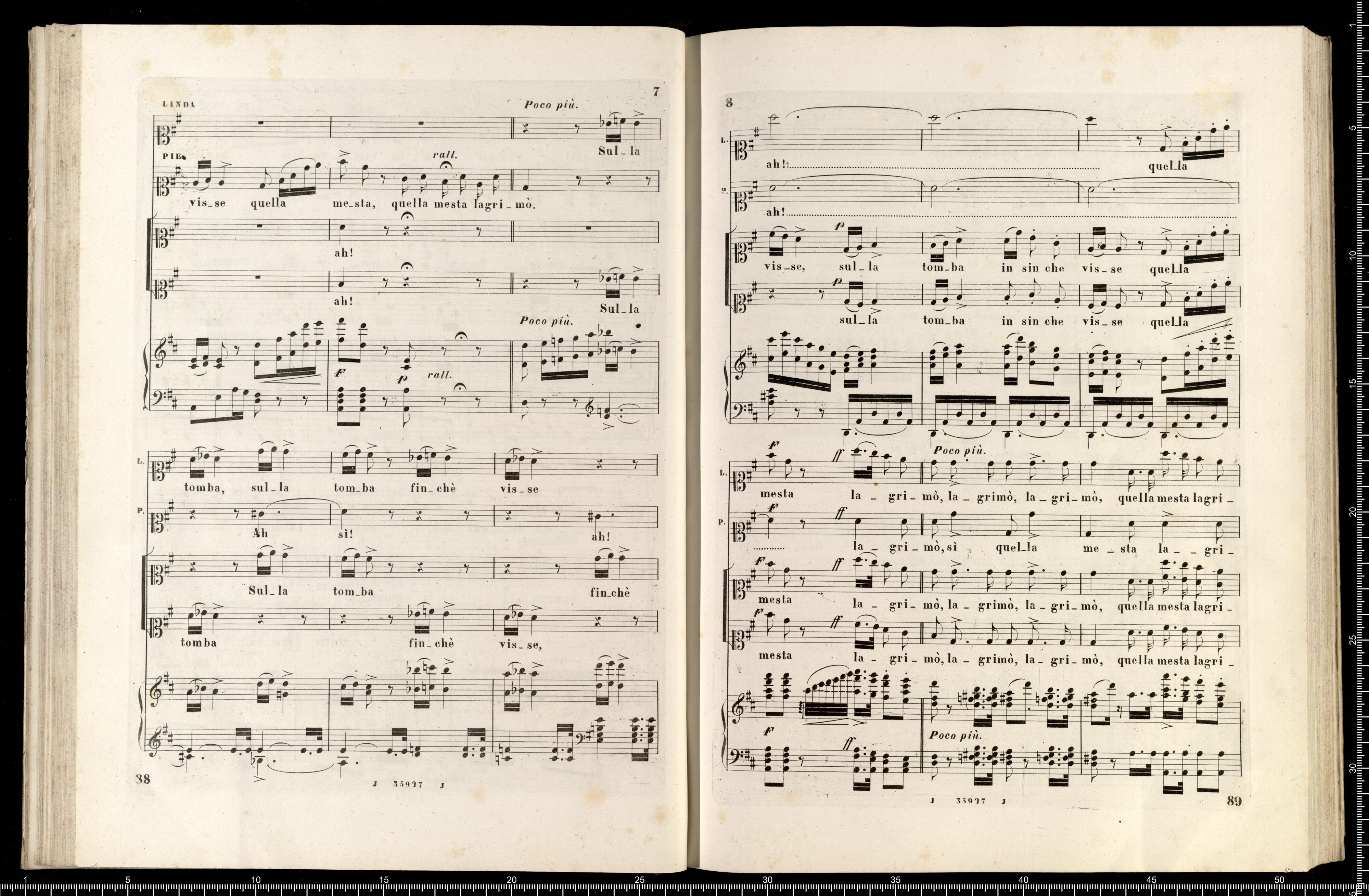 [cover - without title] [title page:] LINDA DI CHAMOUNIX | MELODRAMMA IN TRE ATTI DI G. ROSSI | posto in musica ed umilimente dedicato a S. M. | MARIA ANNA CAROLINA | Imperatrice d'Austria, Regina di Boemia, ecc., ecc. | DA | GAETANO DONIZETTI | Maestro di Cappella di Camera e Compisitore di Corte di S. M. l'Omperatore d'Austria. | RAPPRENENTATO PER LA PRIMA VOLTA AL TEATRO DI PORTA CARINZIA IN VIENNA | LA PRIMAVERA 1842 | RIDUZIONE PER CANTO E PIANOFORTE | NUOVA EDIZIONE RIVEDUTA | coi pezzi aggiunti dall'Autore a Parigi | Proprietà dell'Editore Fr. 36 - | R. Stabilimento Musicale Ricordi | MILANO | NAPOLI - ROMA - FIRENZE