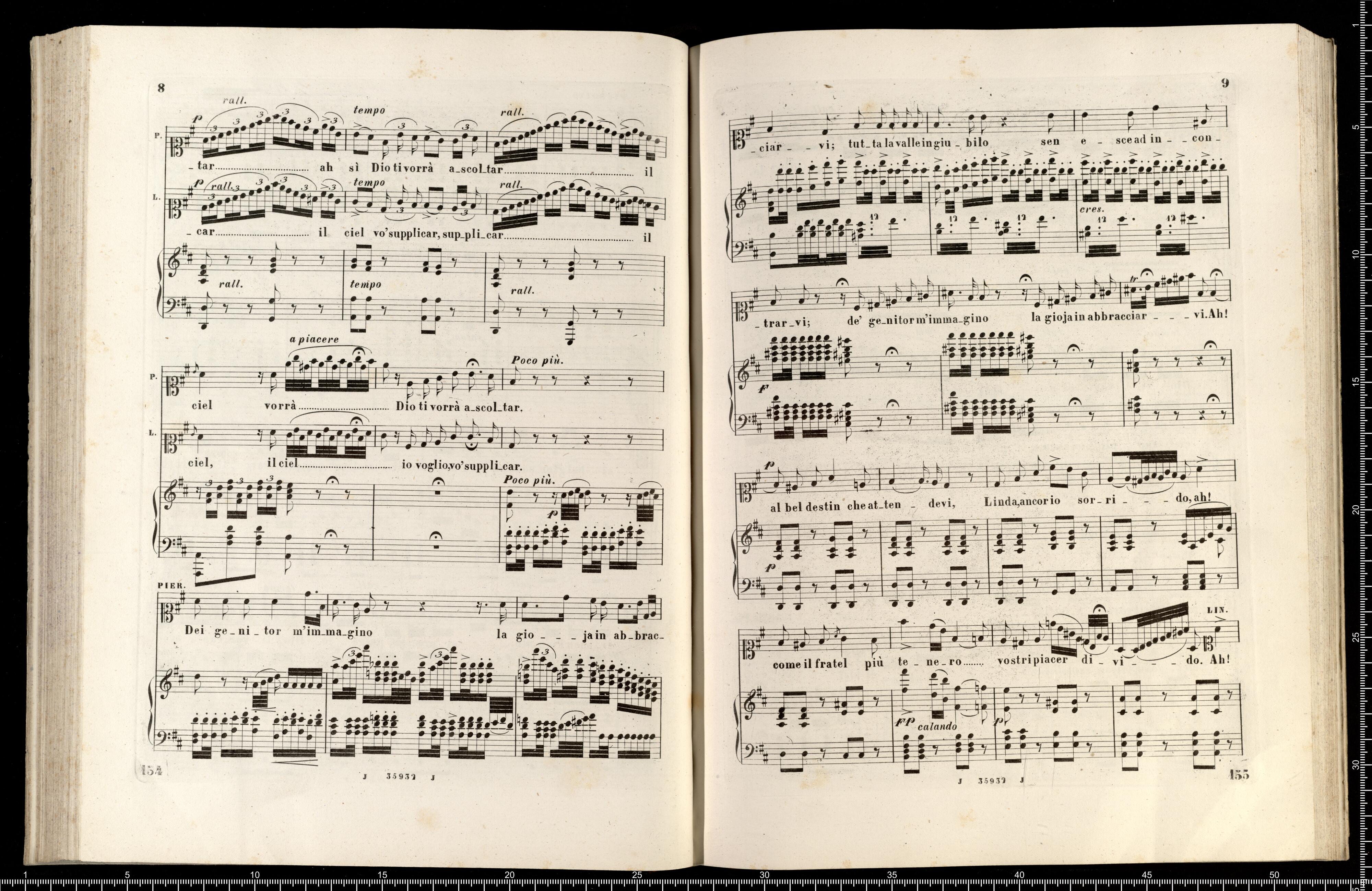 [cover - without title] [title page:] LINDA DI CHAMOUNIX | MELODRAMMA IN TRE ATTI DI G. ROSSI | posto in musica ed umilimente dedicato a S. M. | MARIA ANNA CAROLINA | Imperatrice d'Austria, Regina di Boemia, ecc., ecc. | DA | GAETANO DONIZETTI | Maestro di Cappella di Camera e Compisitore di Corte di S. M. l'Omperatore d'Austria. | RAPPRENENTATO PER LA PRIMA VOLTA AL TEATRO DI PORTA CARINZIA IN VIENNA | LA PRIMAVERA 1842 | RIDUZIONE PER CANTO E PIANOFORTE | NUOVA EDIZIONE RIVEDUTA | coi pezzi aggiunti dall'Autore a Parigi | Proprietà dell'Editore Fr. 36 - | R. Stabilimento Musicale Ricordi | MILANO | NAPOLI - ROMA - FIRENZE