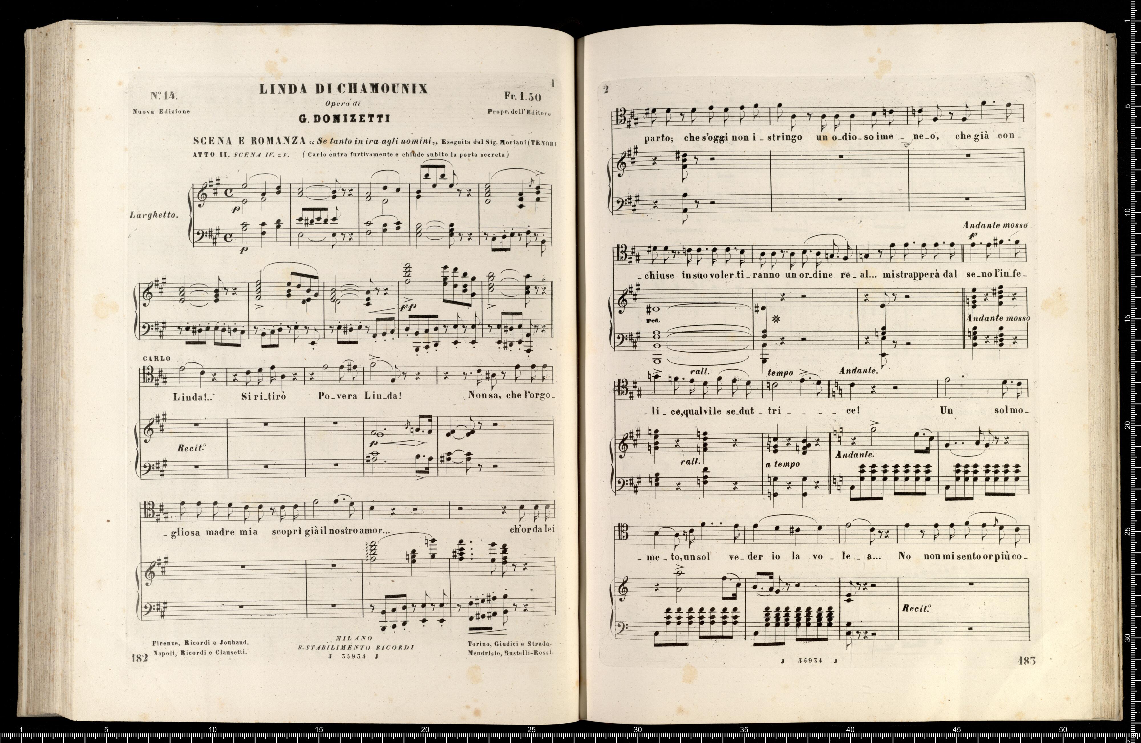 [cover - without title] [title page:] LINDA DI CHAMOUNIX | MELODRAMMA IN TRE ATTI DI G. ROSSI | posto in musica ed umilimente dedicato a S. M. | MARIA ANNA CAROLINA | Imperatrice d'Austria, Regina di Boemia, ecc., ecc. | DA | GAETANO DONIZETTI | Maestro di Cappella di Camera e Compisitore di Corte di S. M. l'Omperatore d'Austria. | RAPPRENENTATO PER LA PRIMA VOLTA AL TEATRO DI PORTA CARINZIA IN VIENNA | LA PRIMAVERA 1842 | RIDUZIONE PER CANTO E PIANOFORTE | NUOVA EDIZIONE RIVEDUTA | coi pezzi aggiunti dall'Autore a Parigi | Proprietà dell'Editore Fr. 36 - | R. Stabilimento Musicale Ricordi | MILANO | NAPOLI - ROMA - FIRENZE