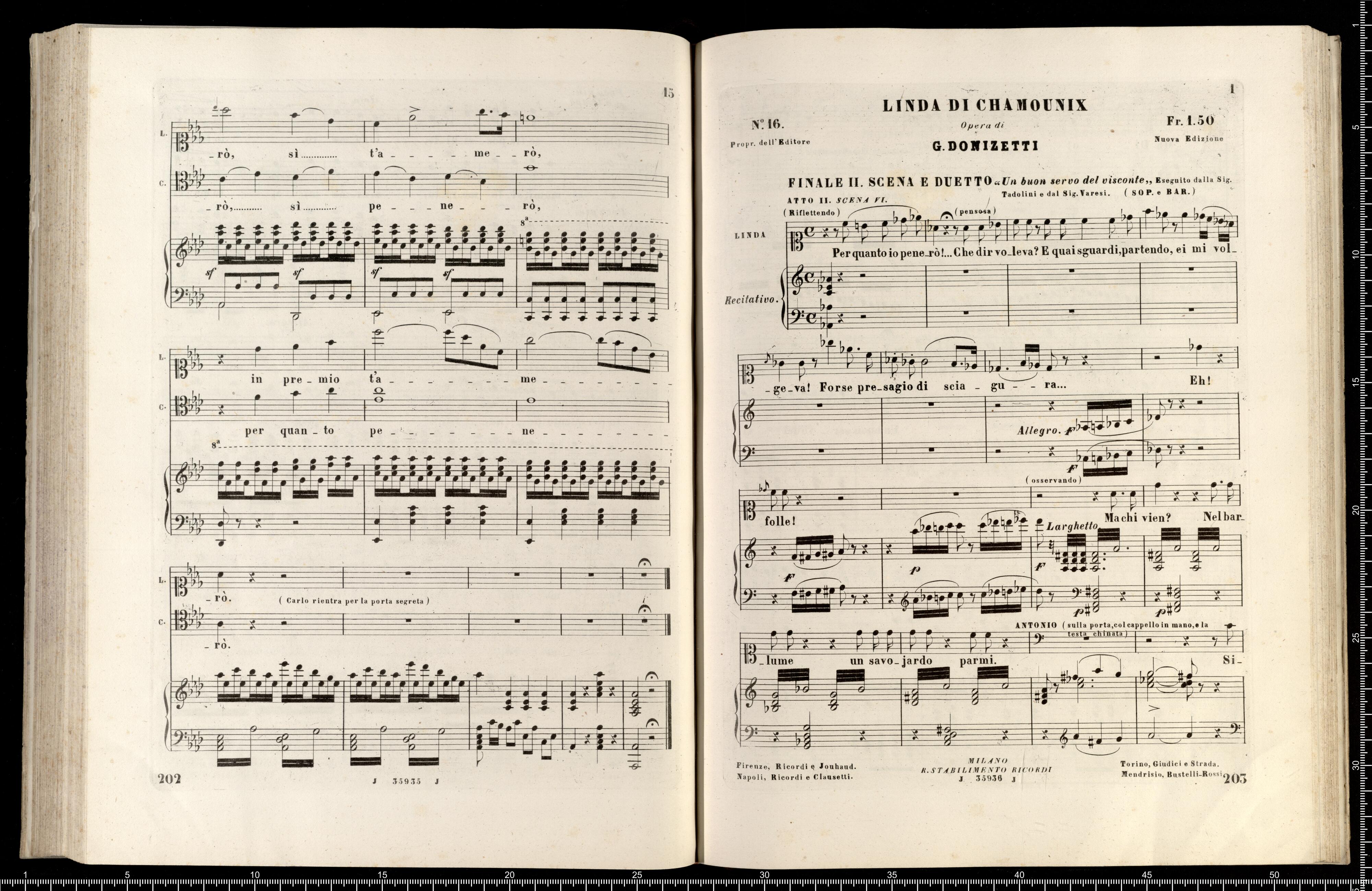 [cover - without title] [title page:] LINDA DI CHAMOUNIX | MELODRAMMA IN TRE ATTI DI G. ROSSI | posto in musica ed umilimente dedicato a S. M. | MARIA ANNA CAROLINA | Imperatrice d'Austria, Regina di Boemia, ecc., ecc. | DA | GAETANO DONIZETTI | Maestro di Cappella di Camera e Compisitore di Corte di S. M. l'Omperatore d'Austria. | RAPPRENENTATO PER LA PRIMA VOLTA AL TEATRO DI PORTA CARINZIA IN VIENNA | LA PRIMAVERA 1842 | RIDUZIONE PER CANTO E PIANOFORTE | NUOVA EDIZIONE RIVEDUTA | coi pezzi aggiunti dall'Autore a Parigi | Proprietà dell'Editore Fr. 36 - | R. Stabilimento Musicale Ricordi | MILANO | NAPOLI - ROMA - FIRENZE