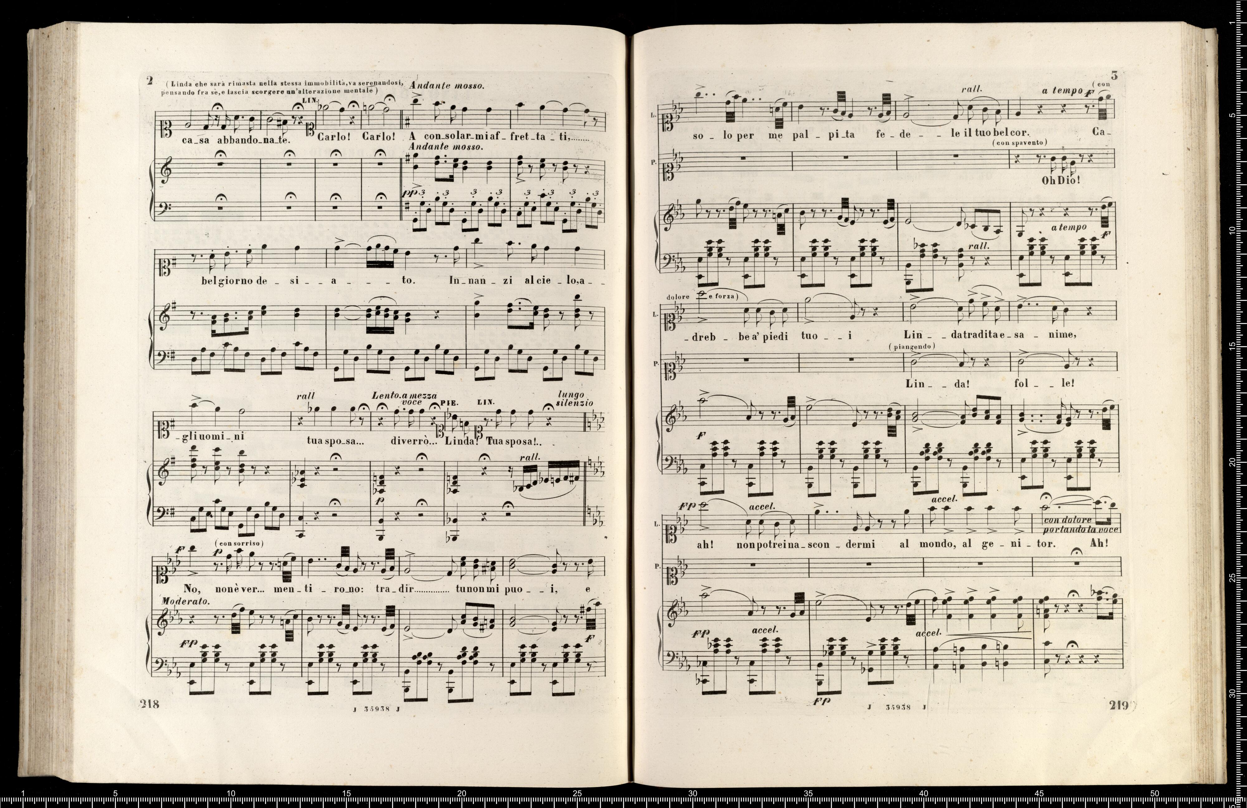 [cover - without title] [title page:] LINDA DI CHAMOUNIX | MELODRAMMA IN TRE ATTI DI G. ROSSI | posto in musica ed umilimente dedicato a S. M. | MARIA ANNA CAROLINA | Imperatrice d'Austria, Regina di Boemia, ecc., ecc. | DA | GAETANO DONIZETTI | Maestro di Cappella di Camera e Compisitore di Corte di S. M. l'Omperatore d'Austria. | RAPPRENENTATO PER LA PRIMA VOLTA AL TEATRO DI PORTA CARINZIA IN VIENNA | LA PRIMAVERA 1842 | RIDUZIONE PER CANTO E PIANOFORTE | NUOVA EDIZIONE RIVEDUTA | coi pezzi aggiunti dall'Autore a Parigi | Proprietà dell'Editore Fr. 36 - | R. Stabilimento Musicale Ricordi | MILANO | NAPOLI - ROMA - FIRENZE
