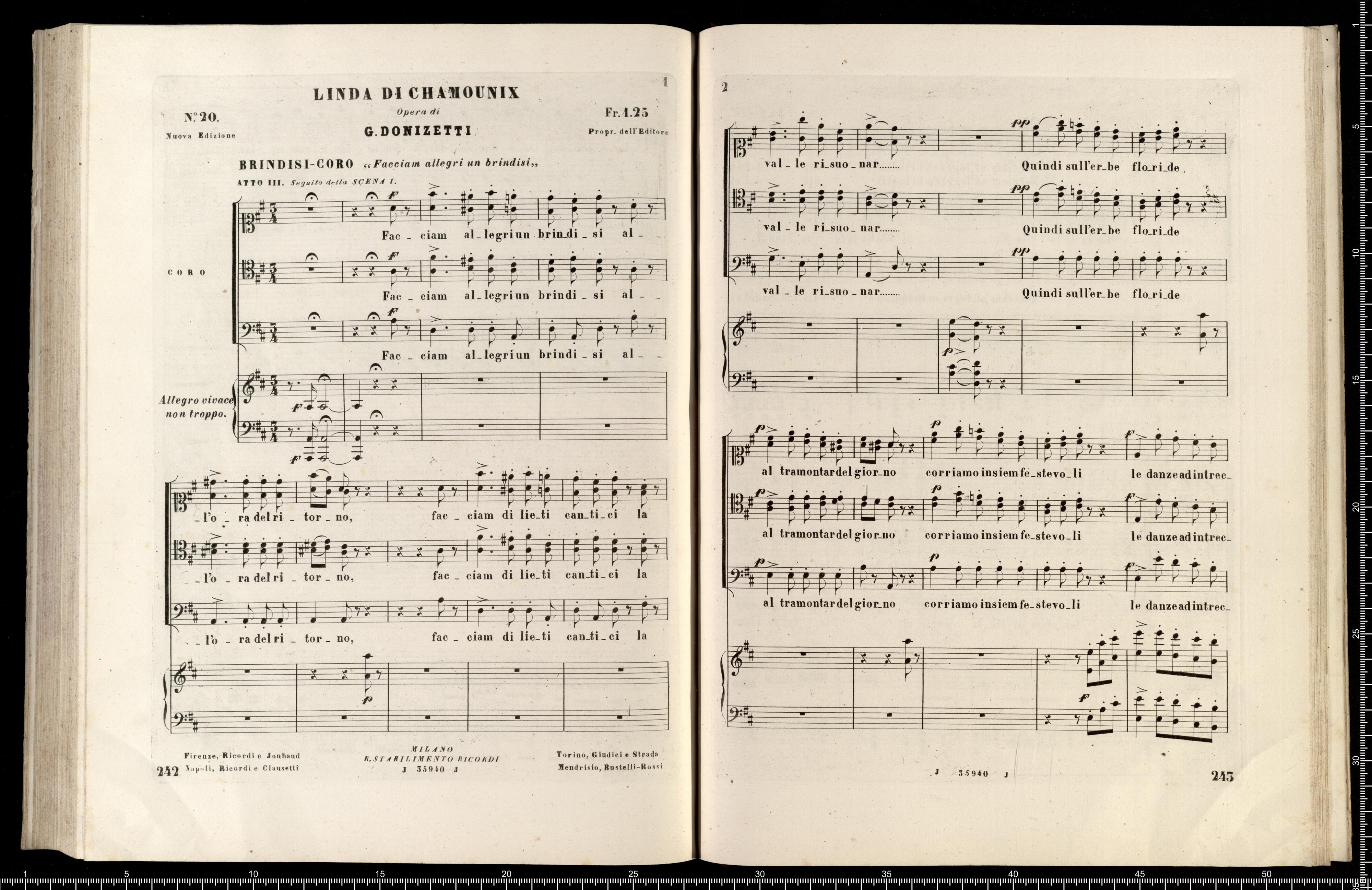 [cover - without title] [title page:] LINDA DI CHAMOUNIX | MELODRAMMA IN TRE ATTI DI G. ROSSI | posto in musica ed umilimente dedicato a S. M. | MARIA ANNA CAROLINA | Imperatrice d'Austria, Regina di Boemia, ecc., ecc. | DA | GAETANO DONIZETTI | Maestro di Cappella di Camera e Compisitore di Corte di S. M. l'Omperatore d'Austria. | RAPPRENENTATO PER LA PRIMA VOLTA AL TEATRO DI PORTA CARINZIA IN VIENNA | LA PRIMAVERA 1842 | RIDUZIONE PER CANTO E PIANOFORTE | NUOVA EDIZIONE RIVEDUTA | coi pezzi aggiunti dall'Autore a Parigi | Proprietà dell'Editore Fr. 36 - | R. Stabilimento Musicale Ricordi | MILANO | NAPOLI - ROMA - FIRENZE